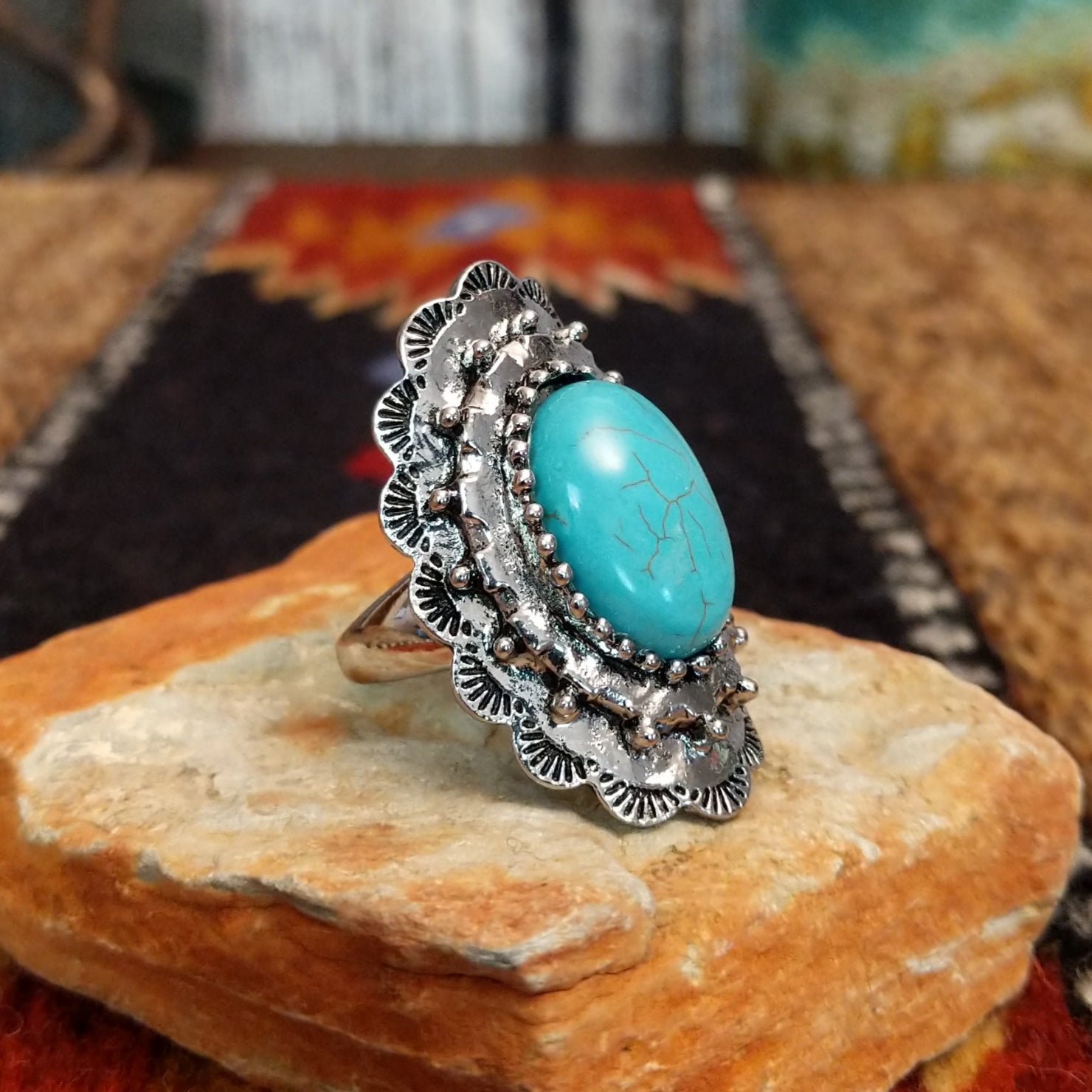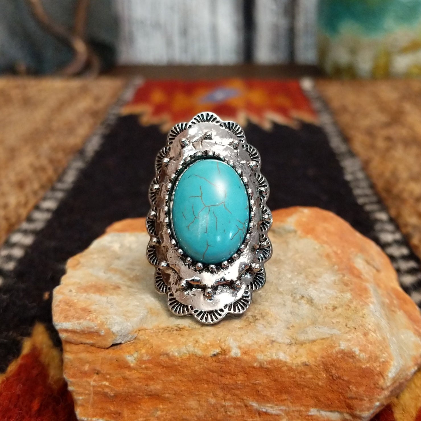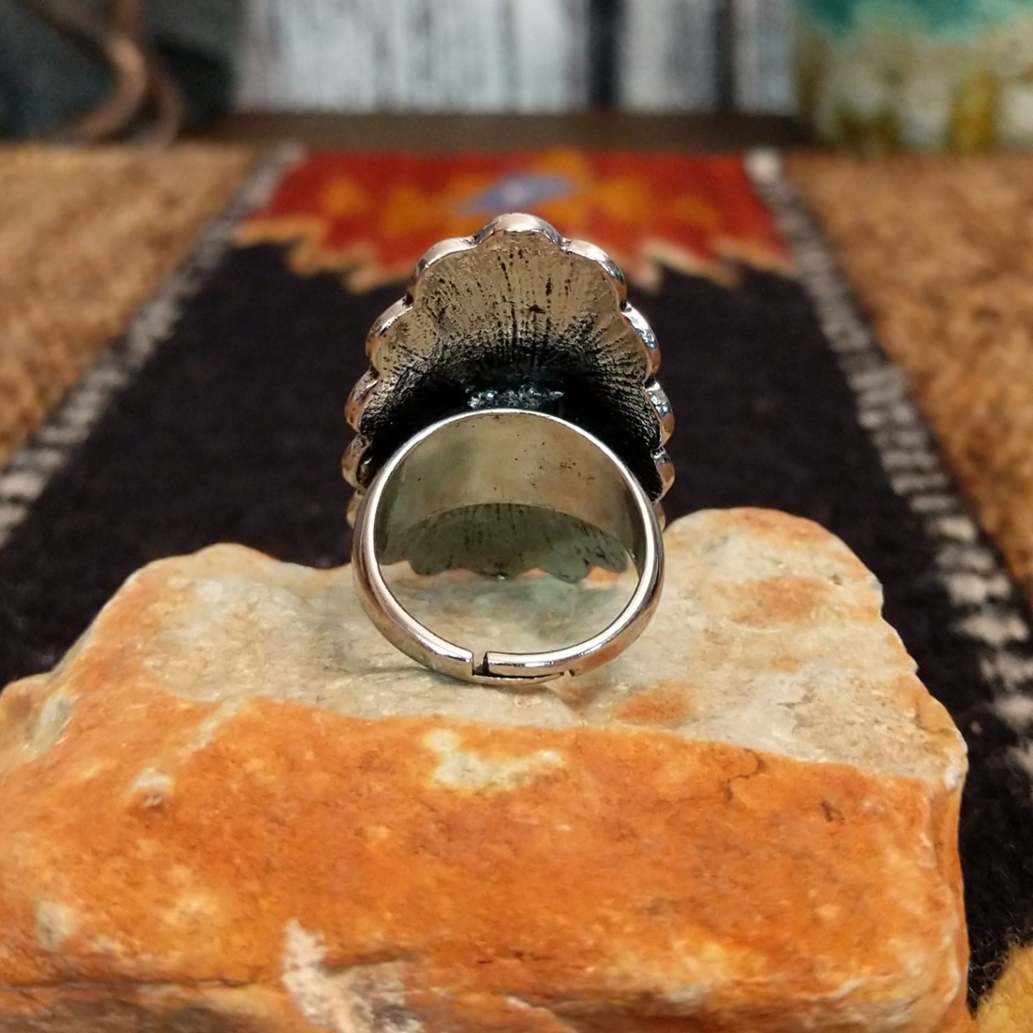 The Desert Flower ring blooms with a vibrant turquoise colored stone set in nickel-free metal. The intricate scalloped edges capture the essence of desert beauty, featuring an adjustable band that expands for larger sizes.