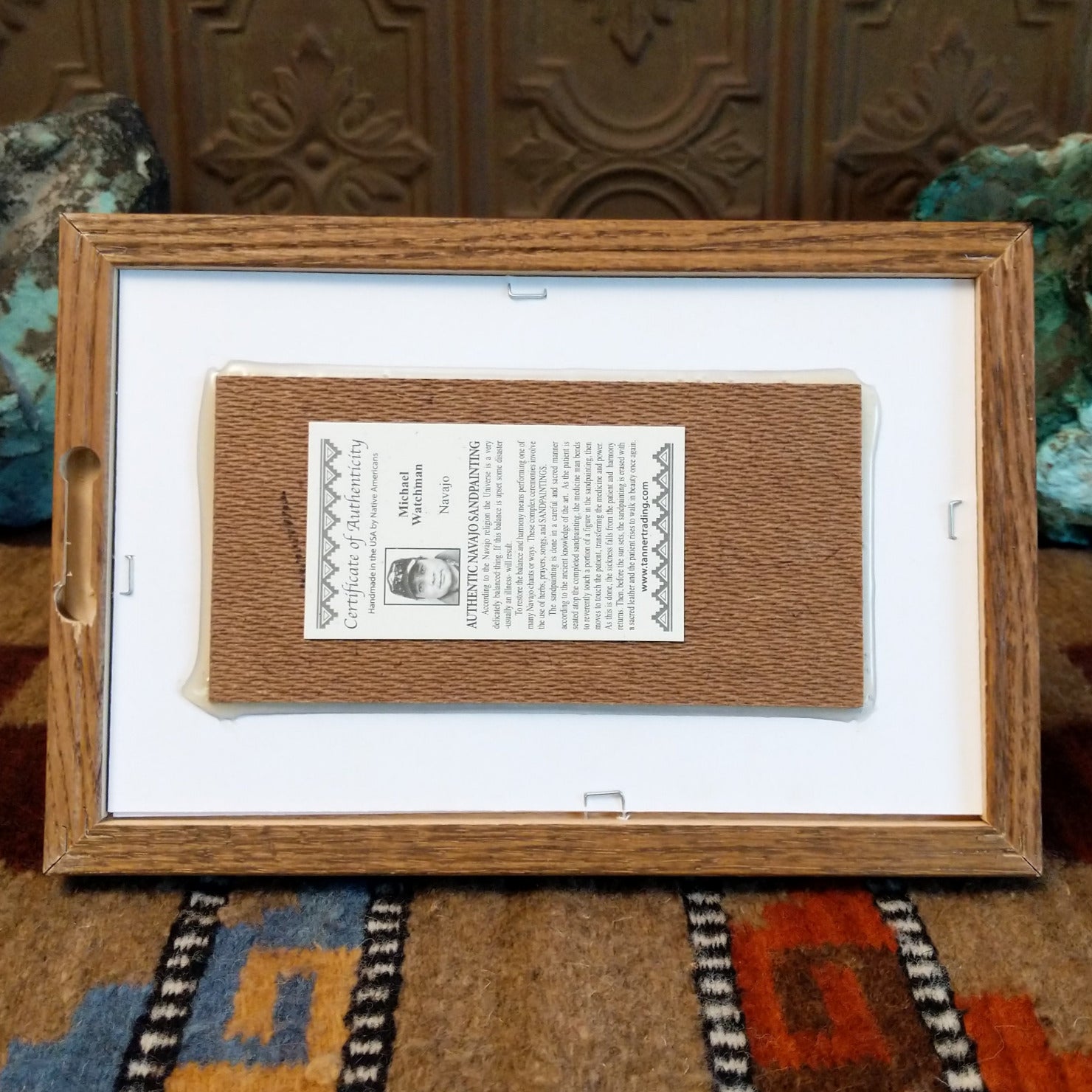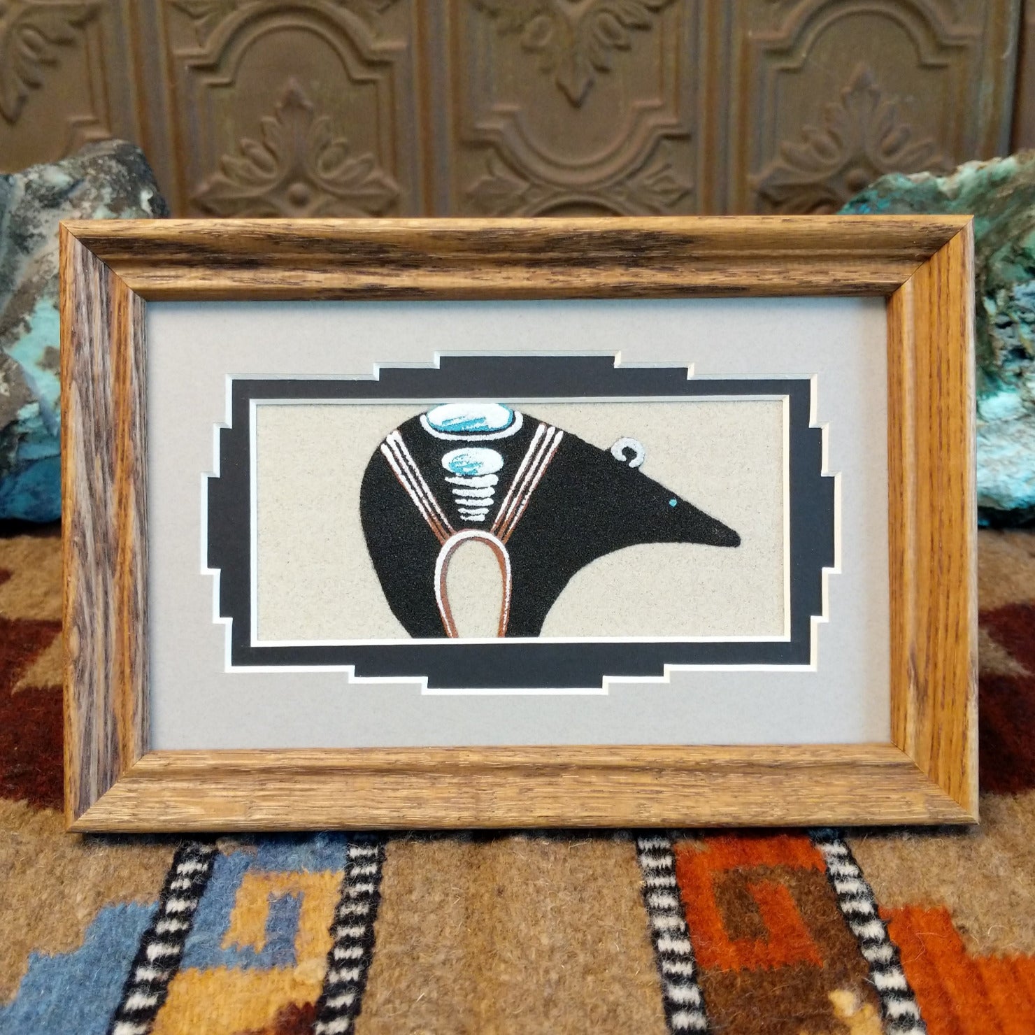 This multicolored sand painting by Navajo artisan Michael Watchman features a Navajo fetish bear set within a wooden frame. Crafted with remarkable precision, the contrasting sand art highlights traditional techniques and deep cultural significance.