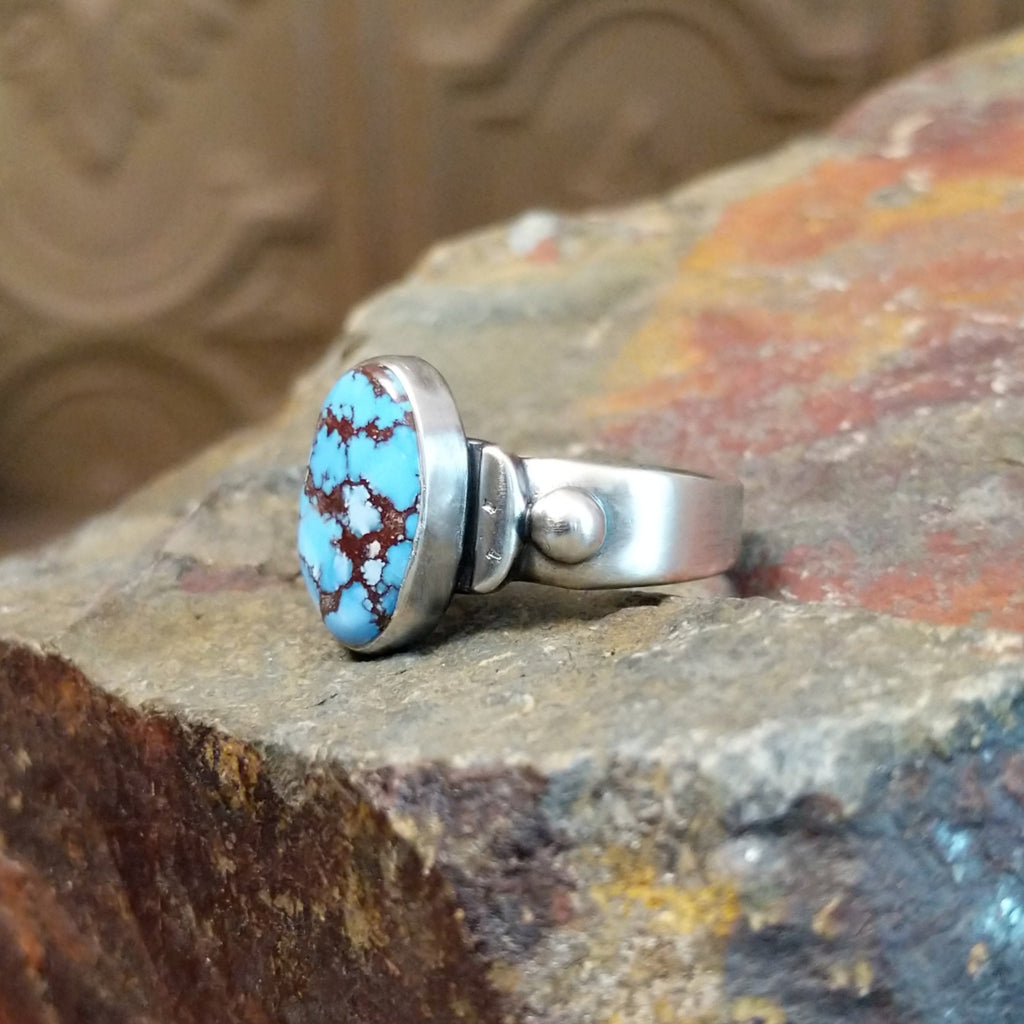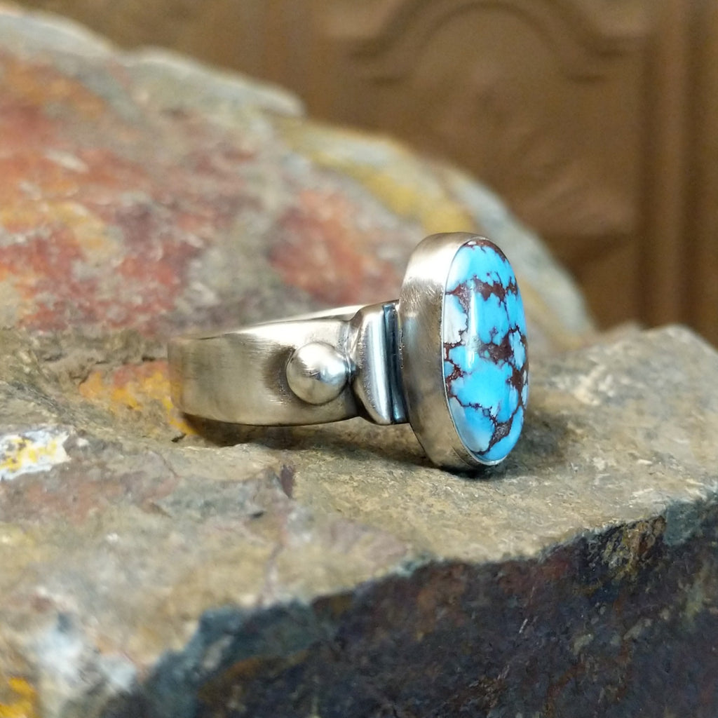 This ring showcases an oval Golden Hills turquoise stone with prominent matrix veining, set in a smooth silver bezel. Two silver ball accents on the band capture the charm of this piece.