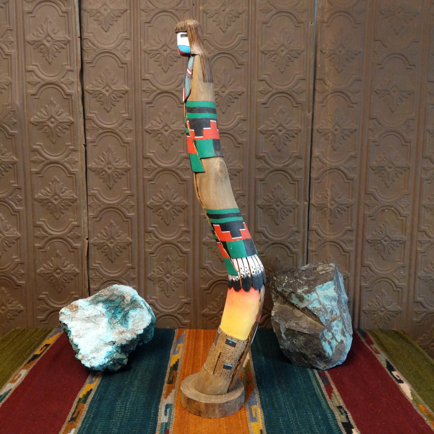 The "Kiva & Longhair" Shalako kachina by Roger Pino is an expertly carved wooden figure featuring vibrant painted designs and adorned with painted feathers along its body. Incorporating a detailed pueblo motif, this piece embodies deep cultural significance and refined craftsmanship.
