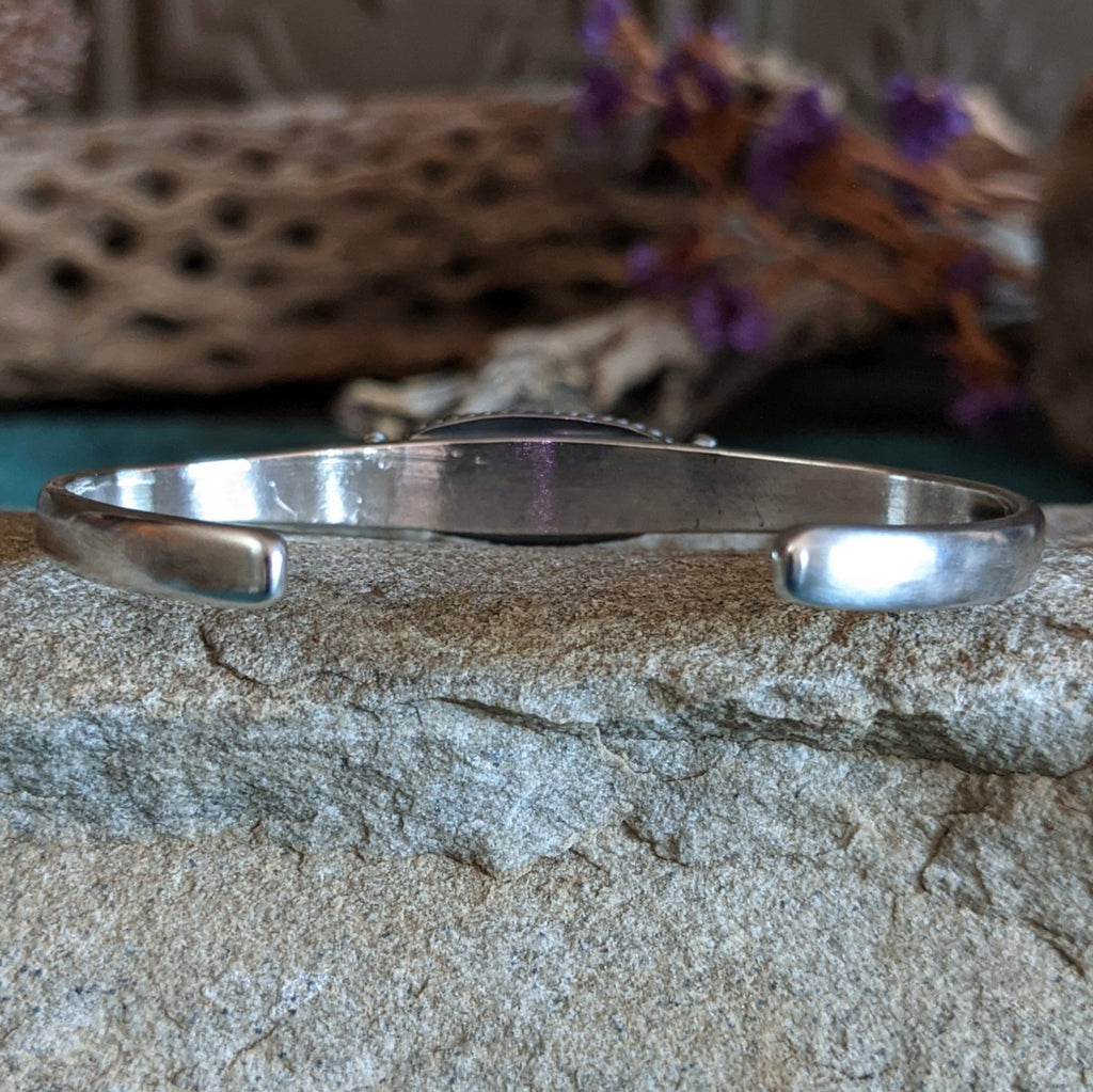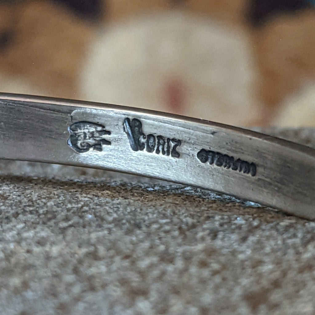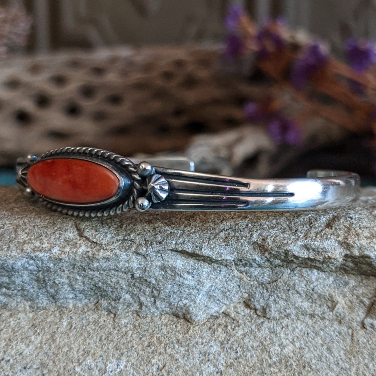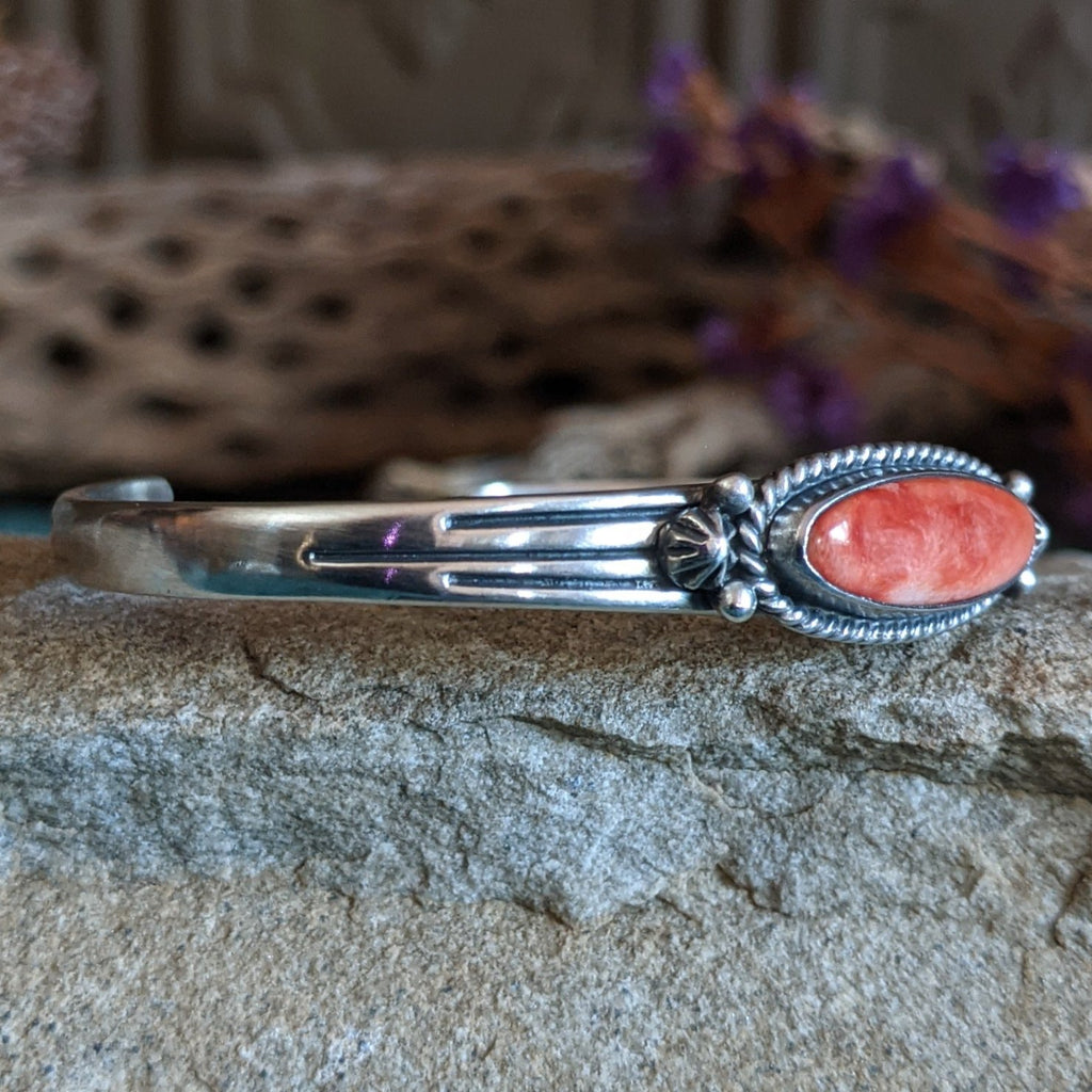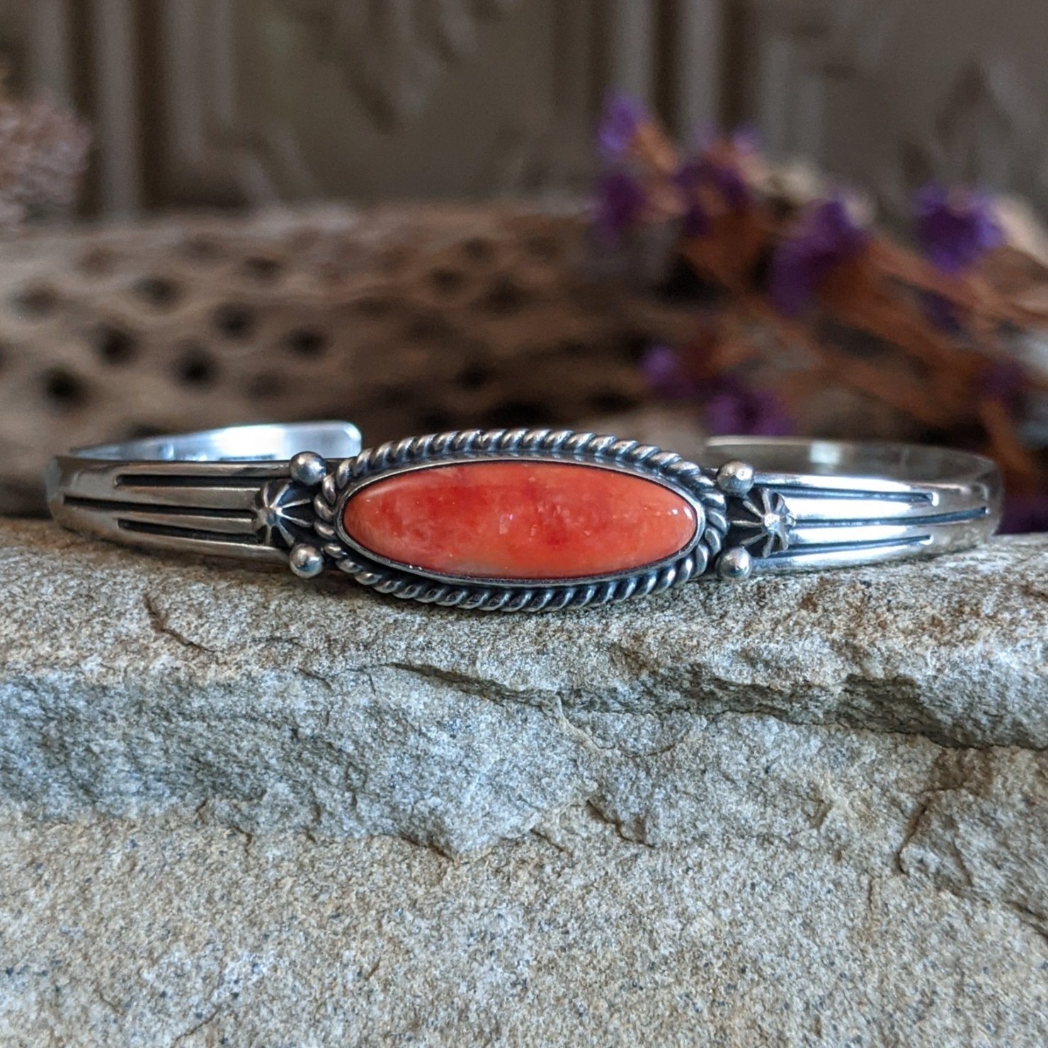 This beautifully patinaed silver cuff by Raymond Coriz features a slender, oval-shaped orange spiny oyster shell as its centerpiece. Delicate silver roping encircles the bezel, while accents of silver dots and stars adorn the band.