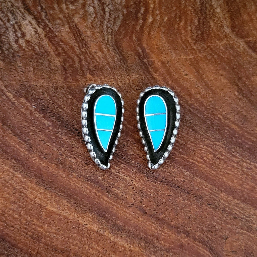 These authentic Zuni handcrafted clip earrings feature Blue Turquoise stones inlaid with sterling silver. In addition, the outer border is done in a "shadow box" to bring contrast making the turquoise pop!