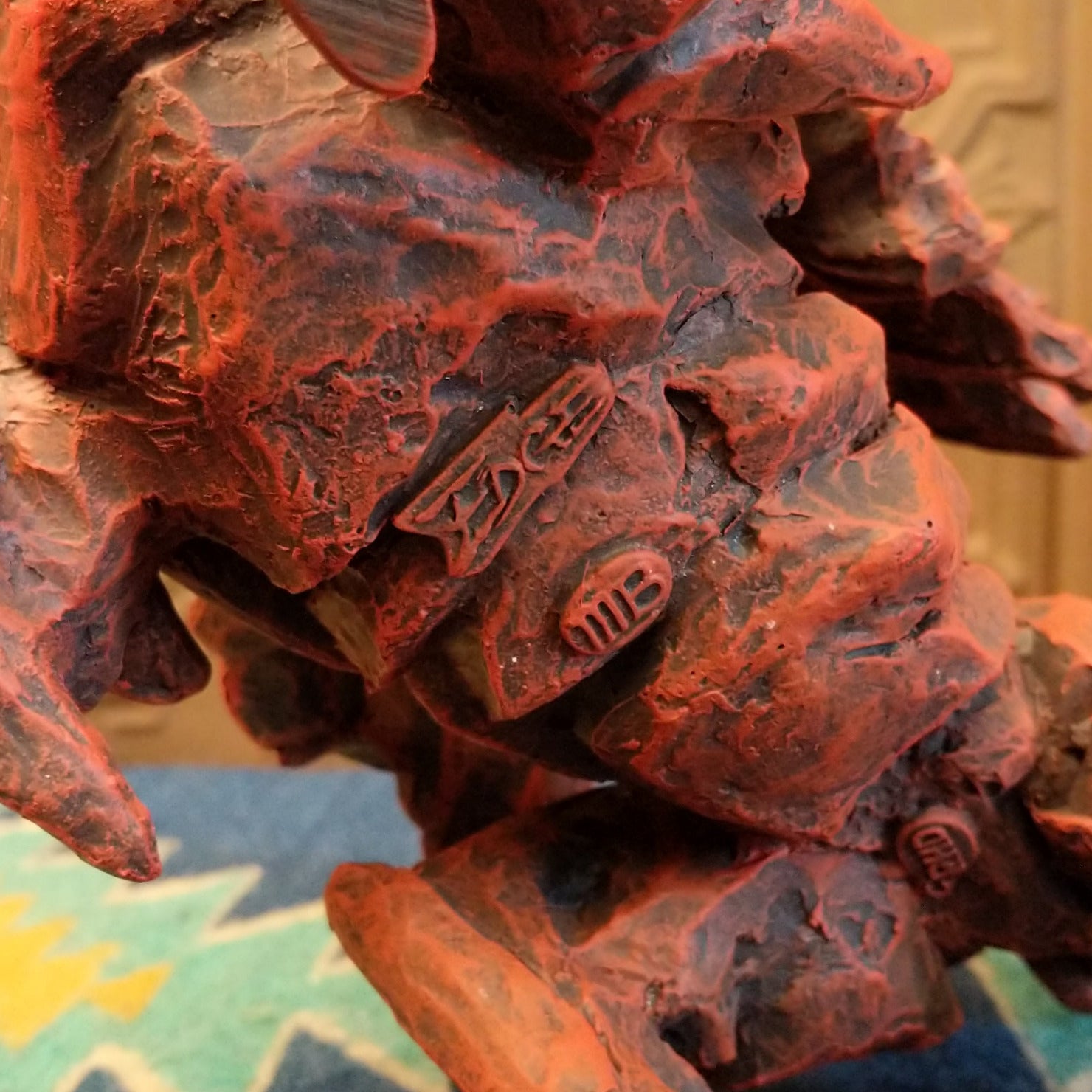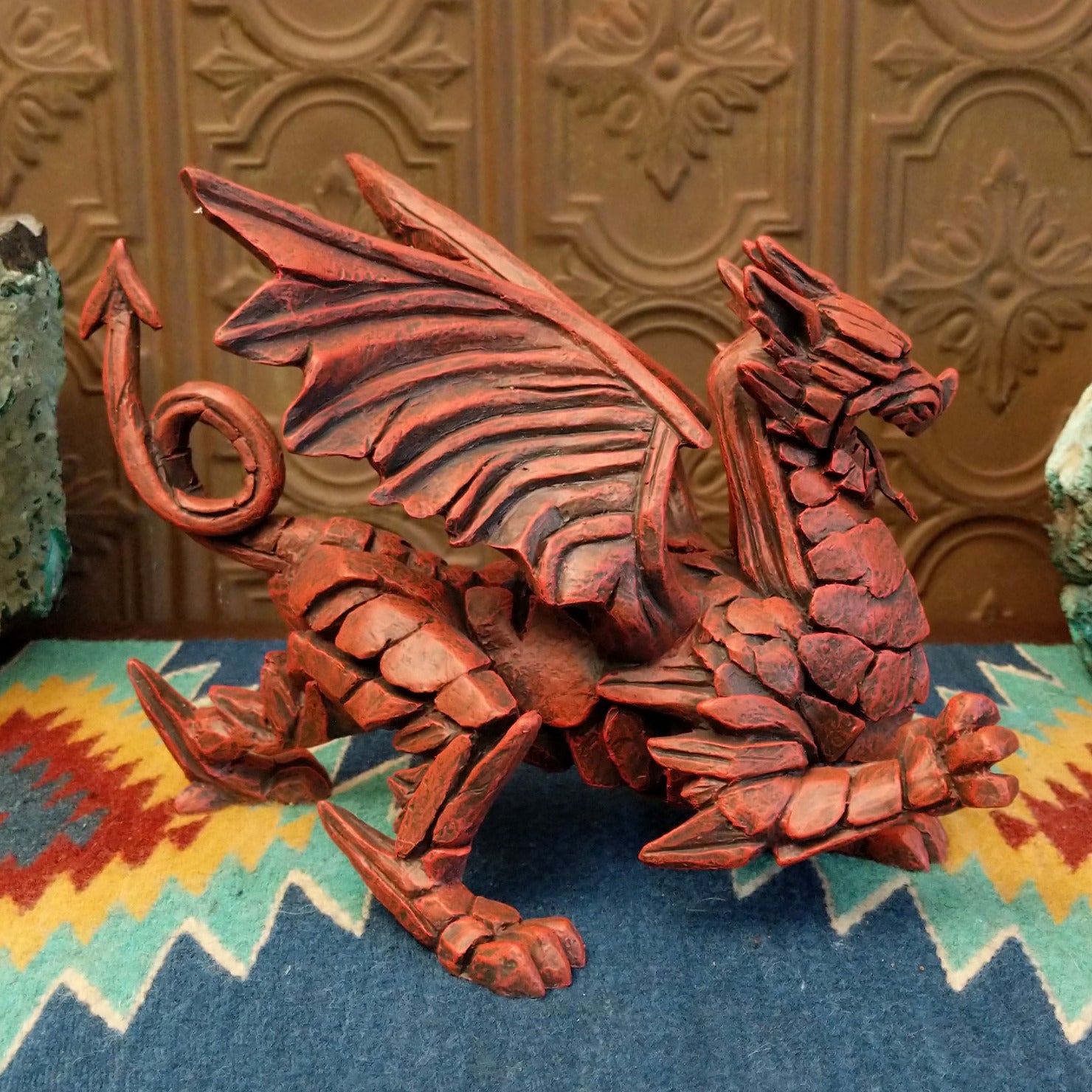 This striking cast marble dragon by Matt Buckley captures raw power in a fierce pose. Painted in vibrant reddish-orange tones, the sculpture showcases masterful craftsmanship with intricate detail work throughout, creating an exceptional statement piece for various collections.