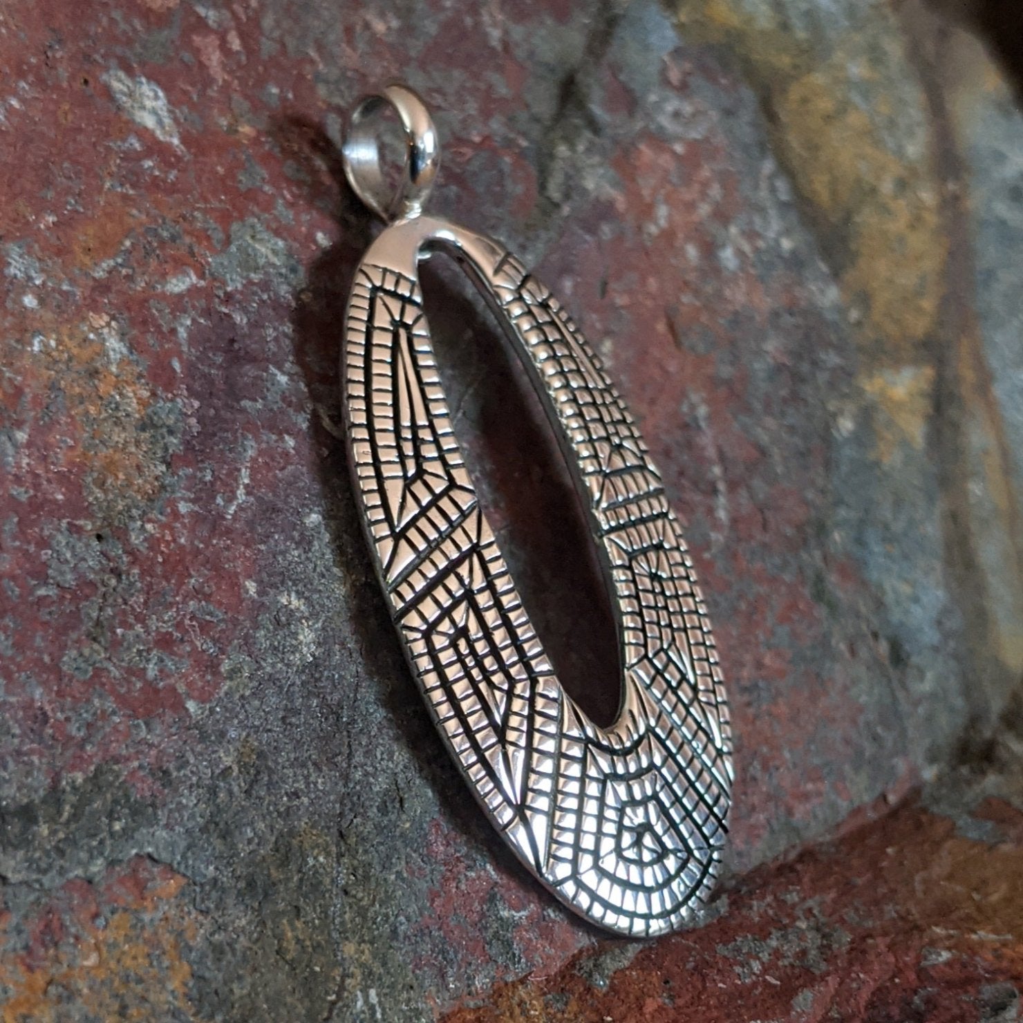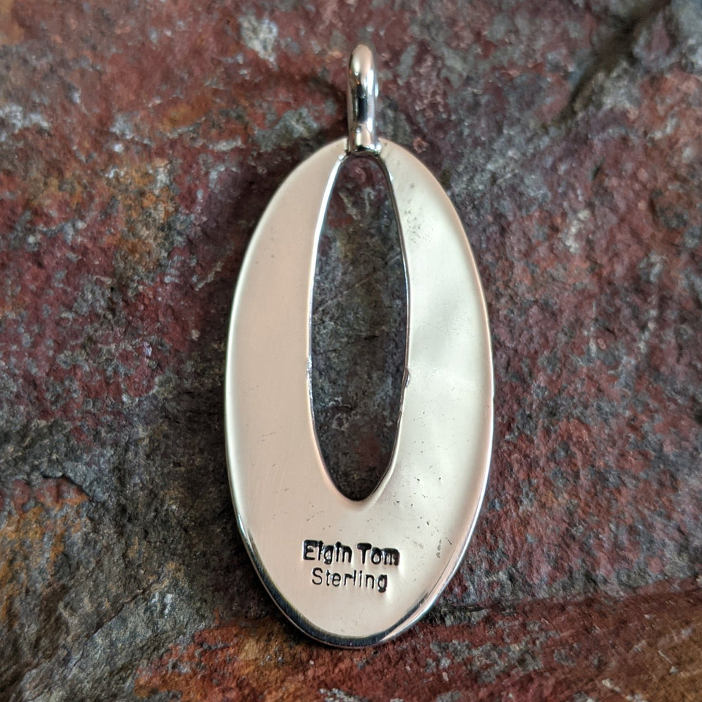 An elegantly crafted pendant designed by Elgin Tom, featuring his signature patterns stamped into the silver for a distinctive design.