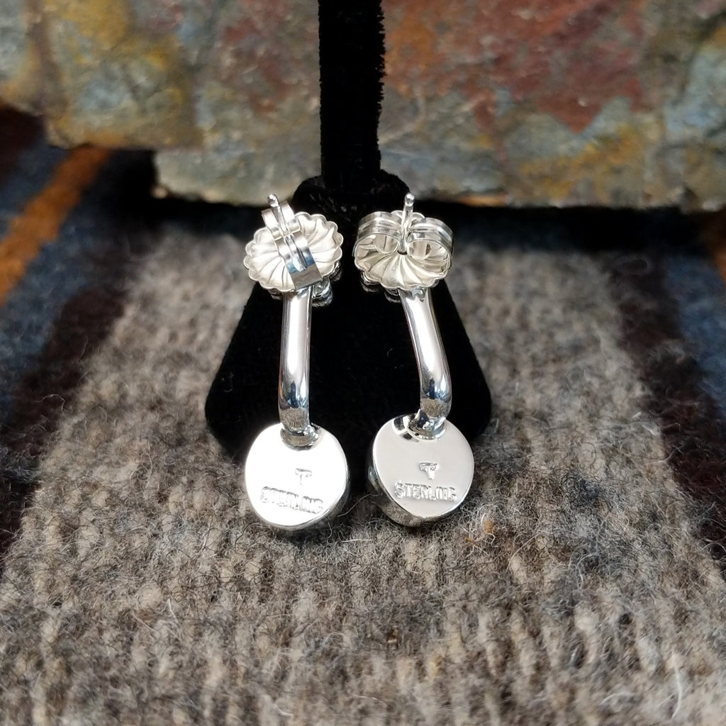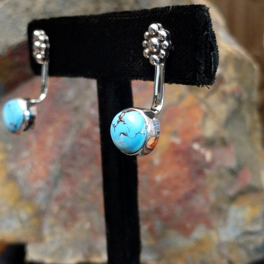 Crafted by Navajo artist Terry Wood, these Golden Hills turquoise adjustable earrings feature round Golden Hills turquoise stones with light brown matrix veining, set in sterling silver with a smooth bezel. The adjustable flower hook design adds a versatile Southwest flair. The top part of the earring can be worm separately as well.