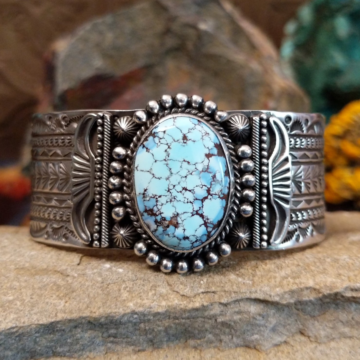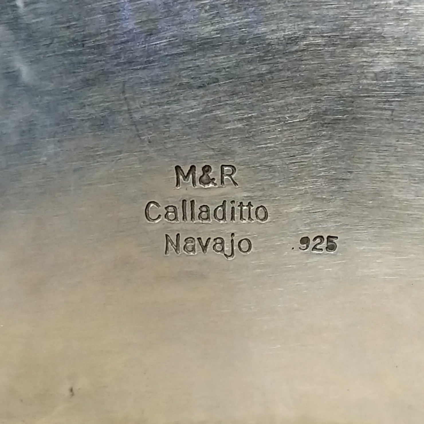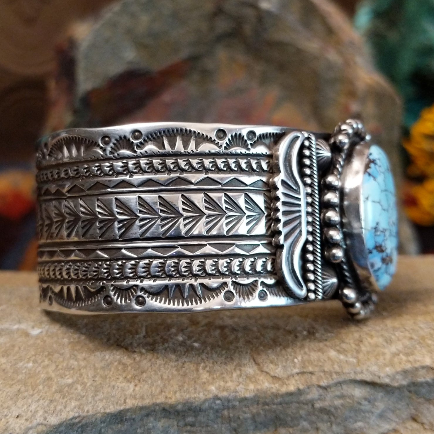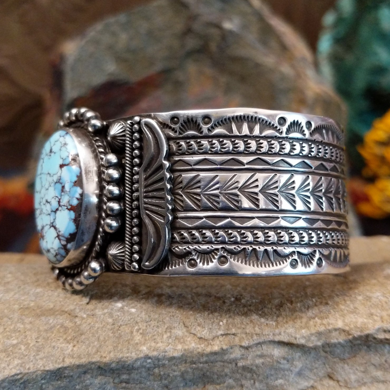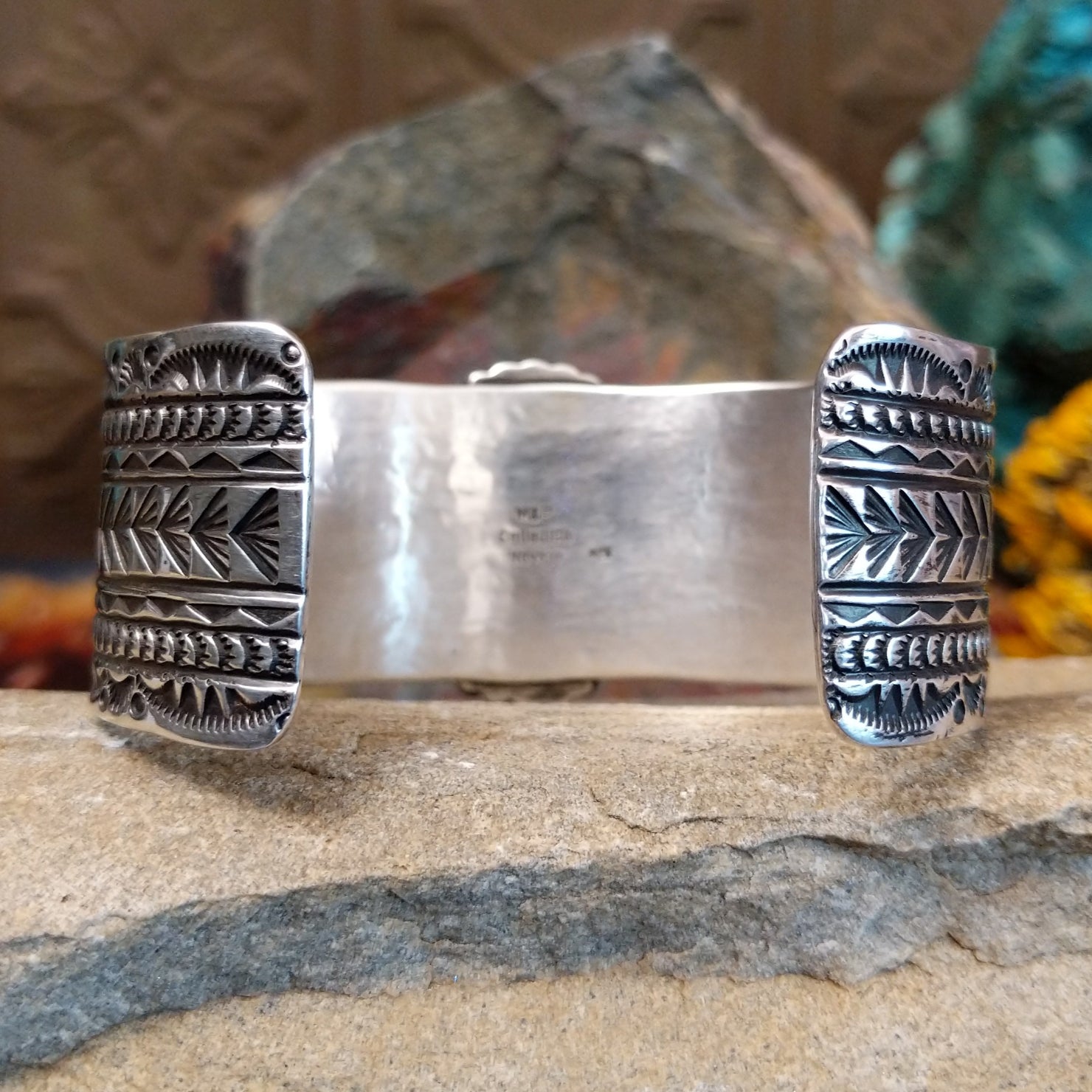 Flawlessly crafted by Michael & Rosita Calladitto, this cuff displays an incredibly beautiful oval of Golden Hills turquoise. Striations streak throughout the stone while the silver of the piece is adorned with details that make the cuff appealing everywhere you look.