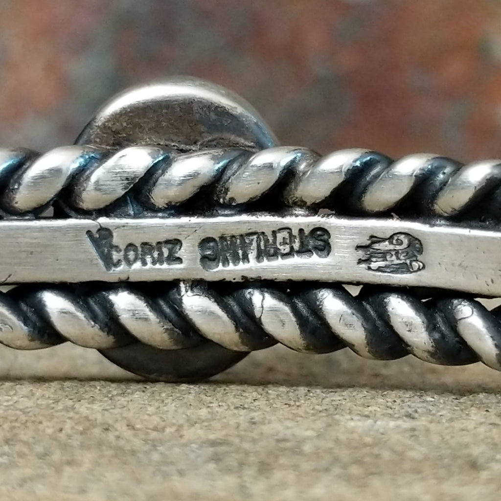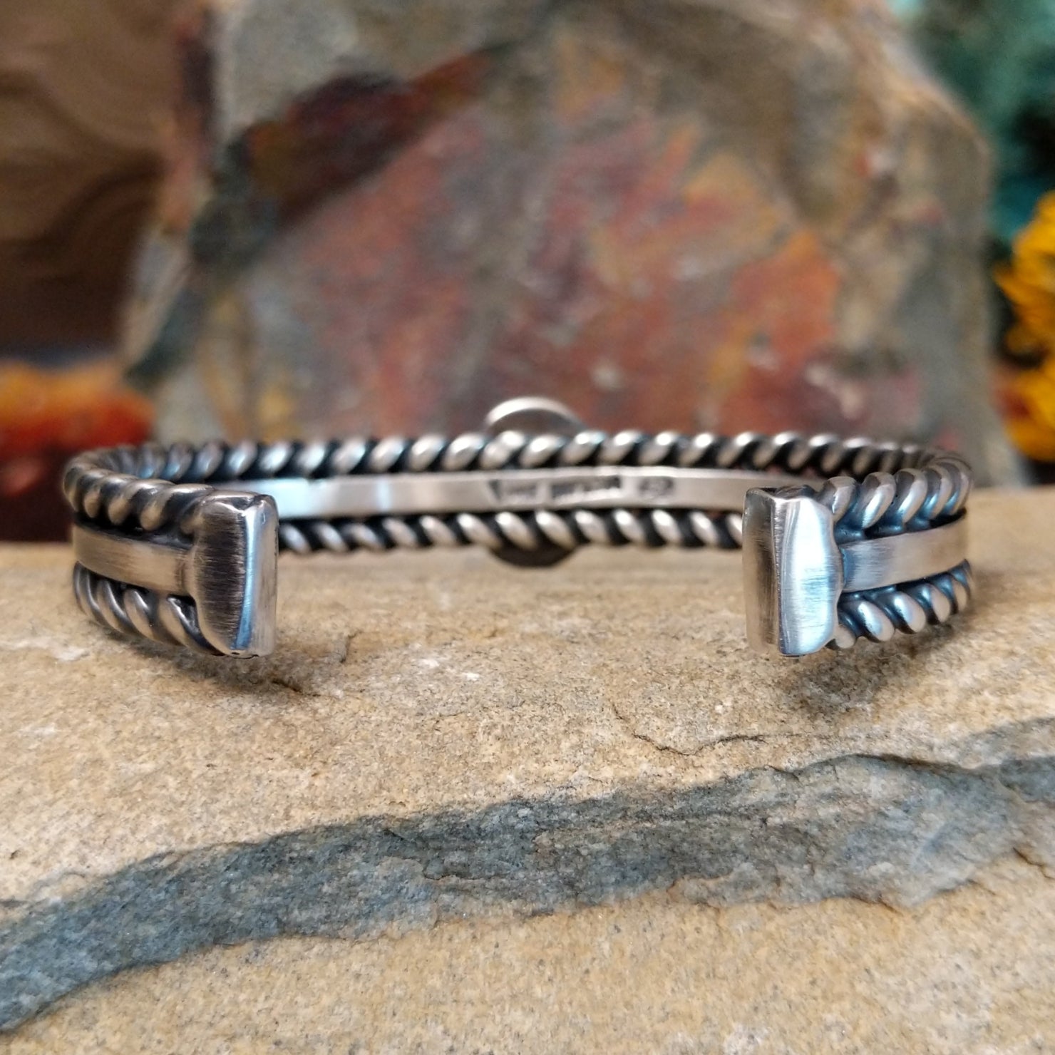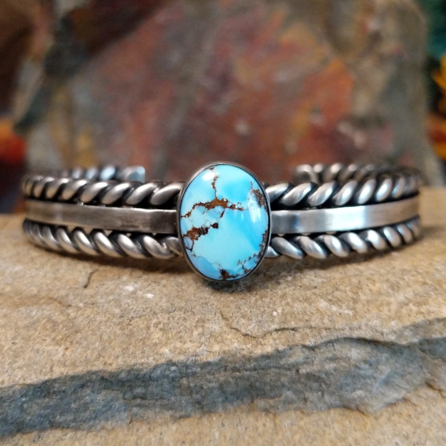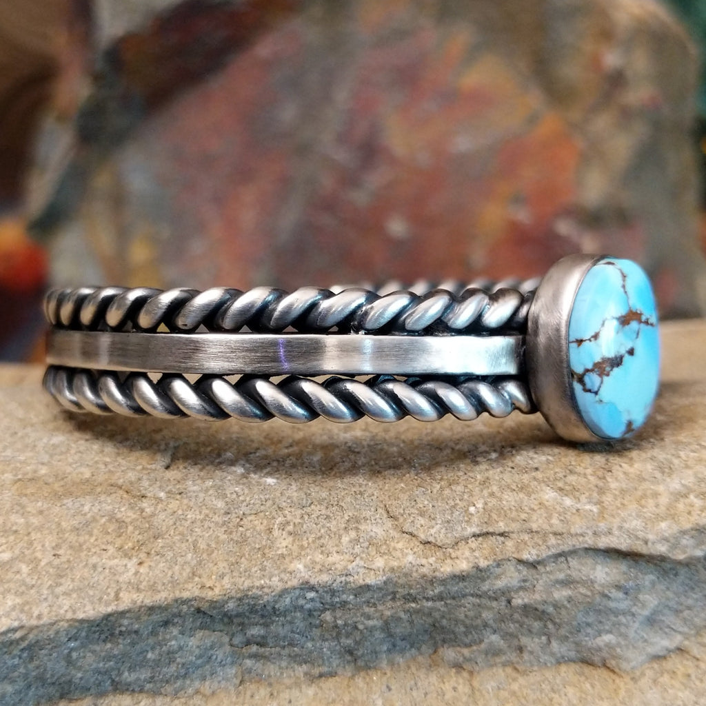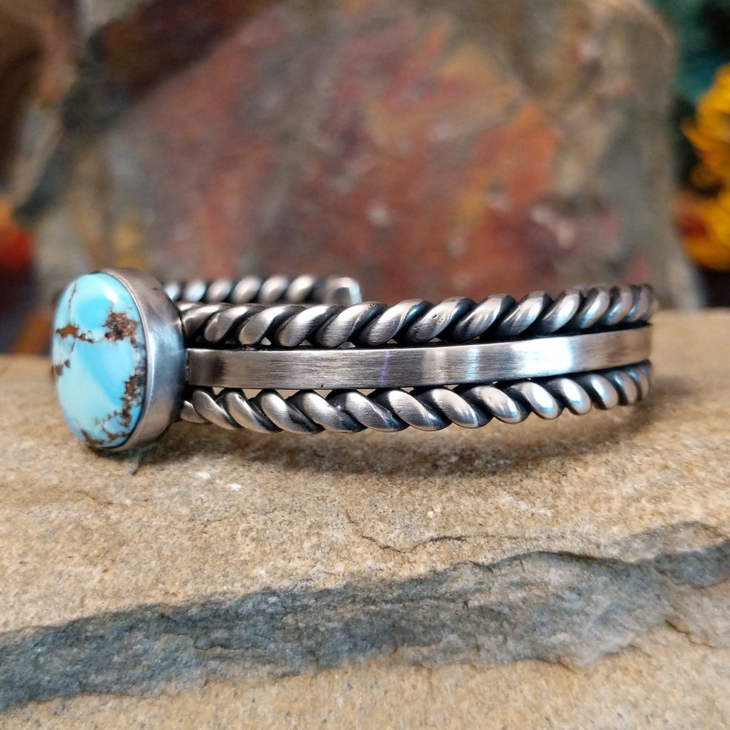 The delicate appeal of this cuff's Golden Hills turquoise is complemented wonderfully by the darker tones of the winding silver rope that runs along the band.