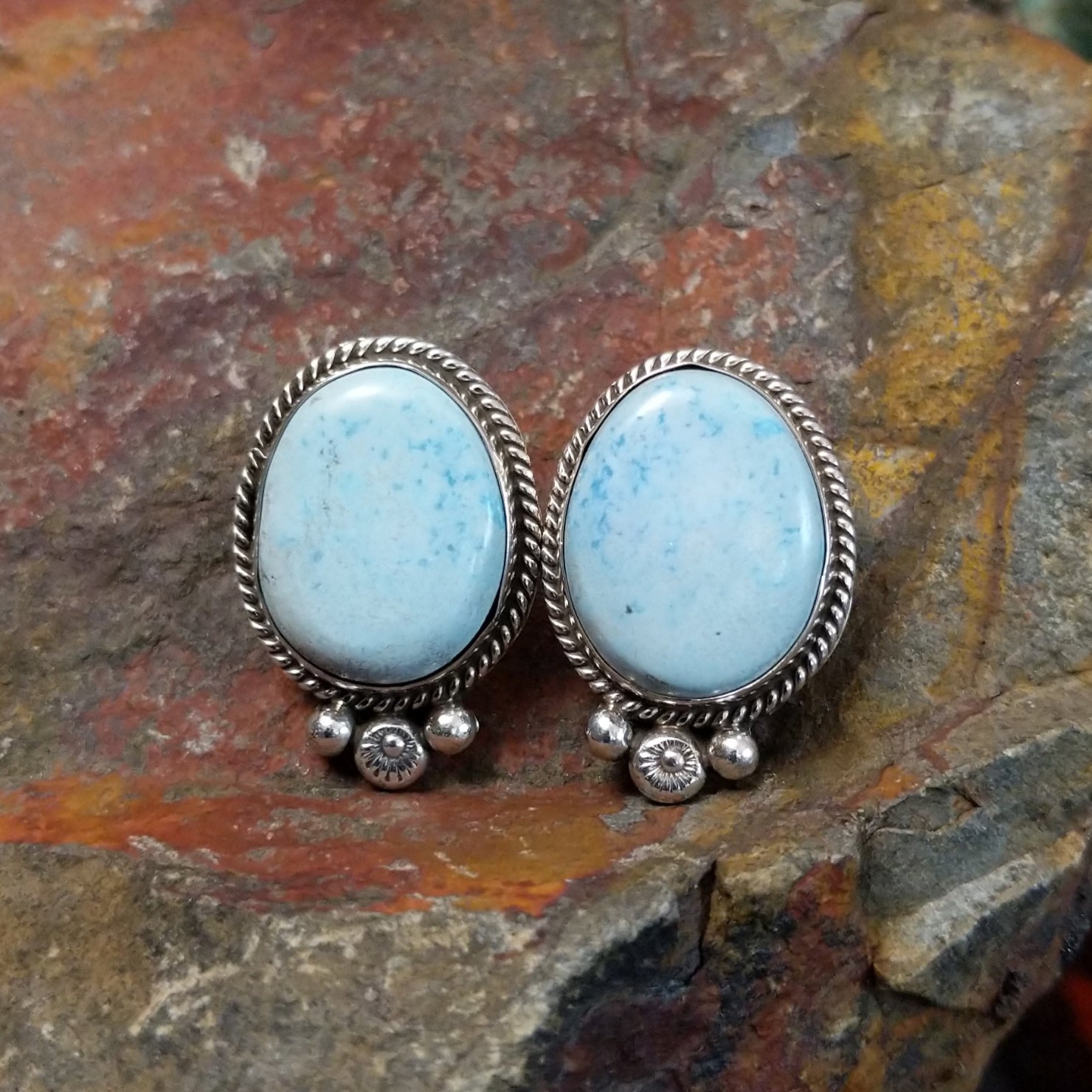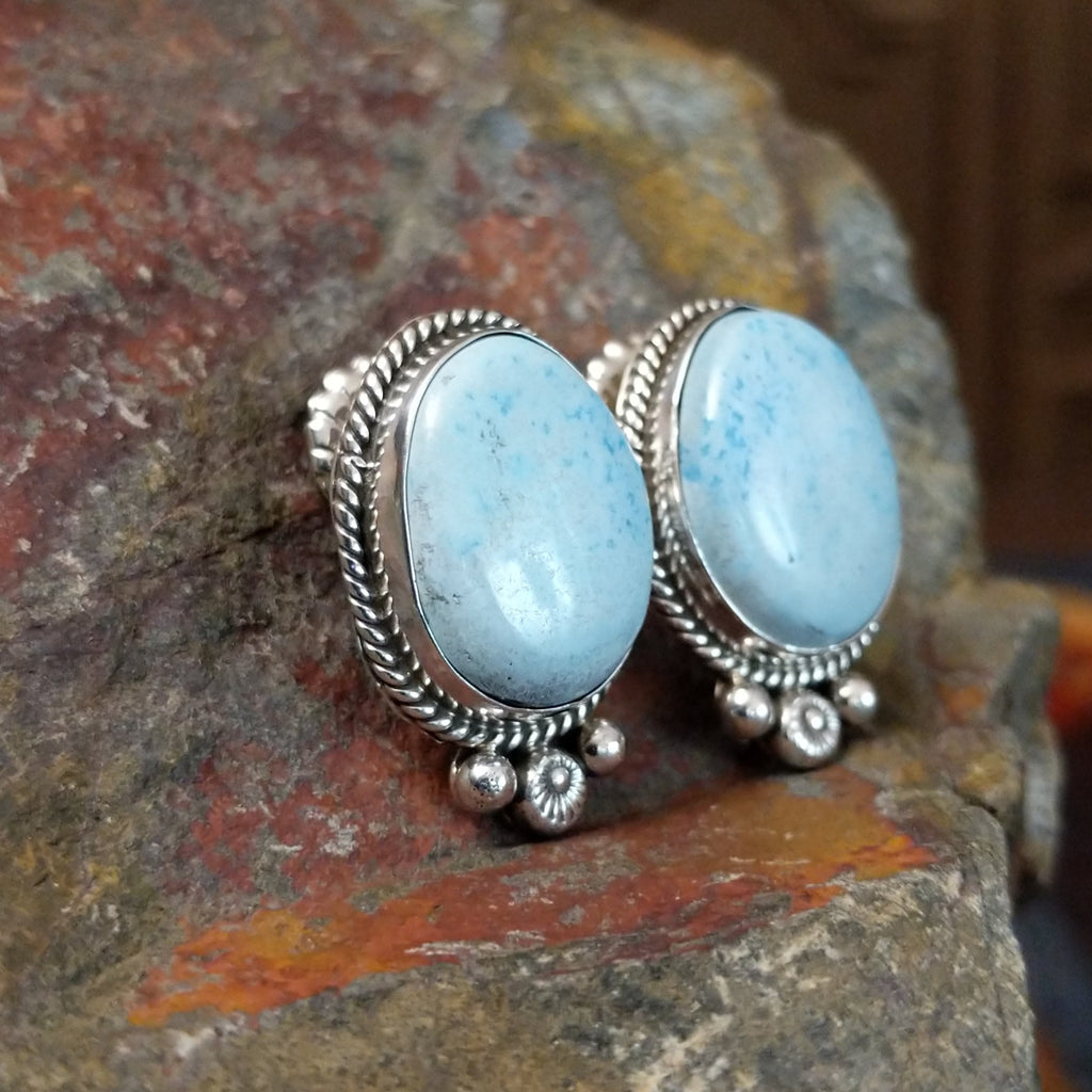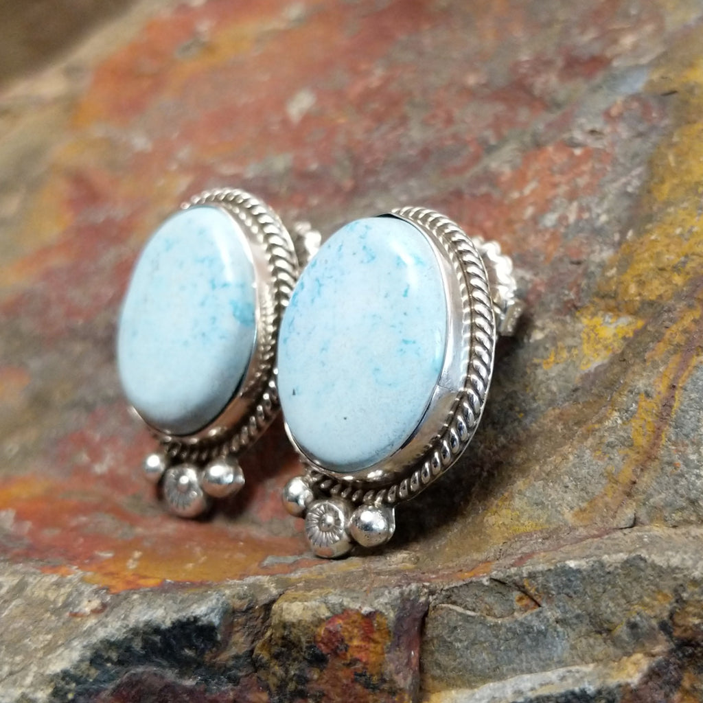 Crafted by Navajo artist Abellene Bahe, these Golden Hills turquoise earrings feature oval Golden Hills turquoise stones with subtle brown matrix veining, set in sterling silver with a twisted rope bezel. Dangling silver beads add a touch of Southwest elegance.