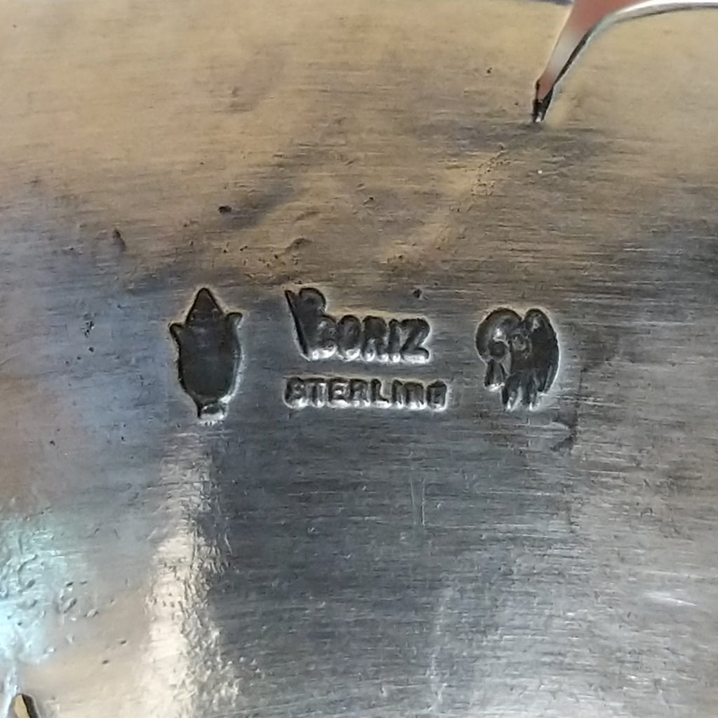 A bright Golden Hills turquoise stone sits on the silver feather of this cuff crafted by Raymond Coriz. A rich patina deepens the finely etched details on this beautiful piece.
