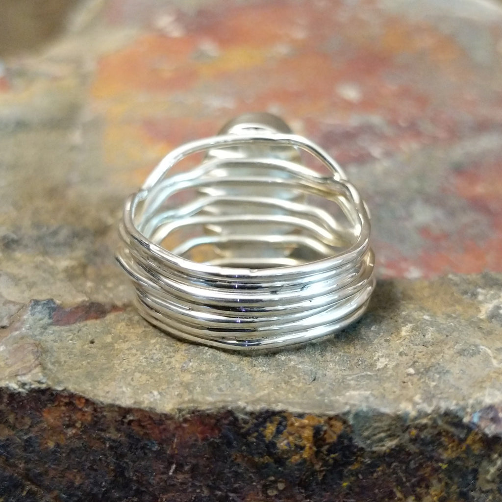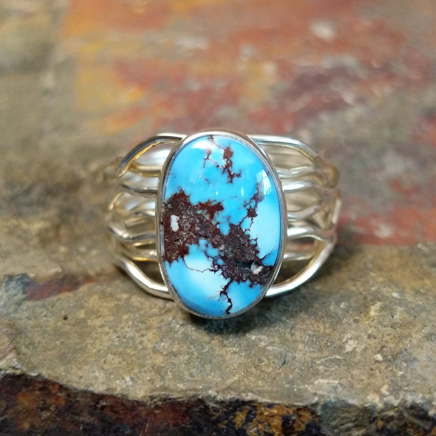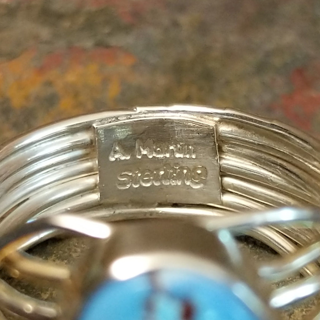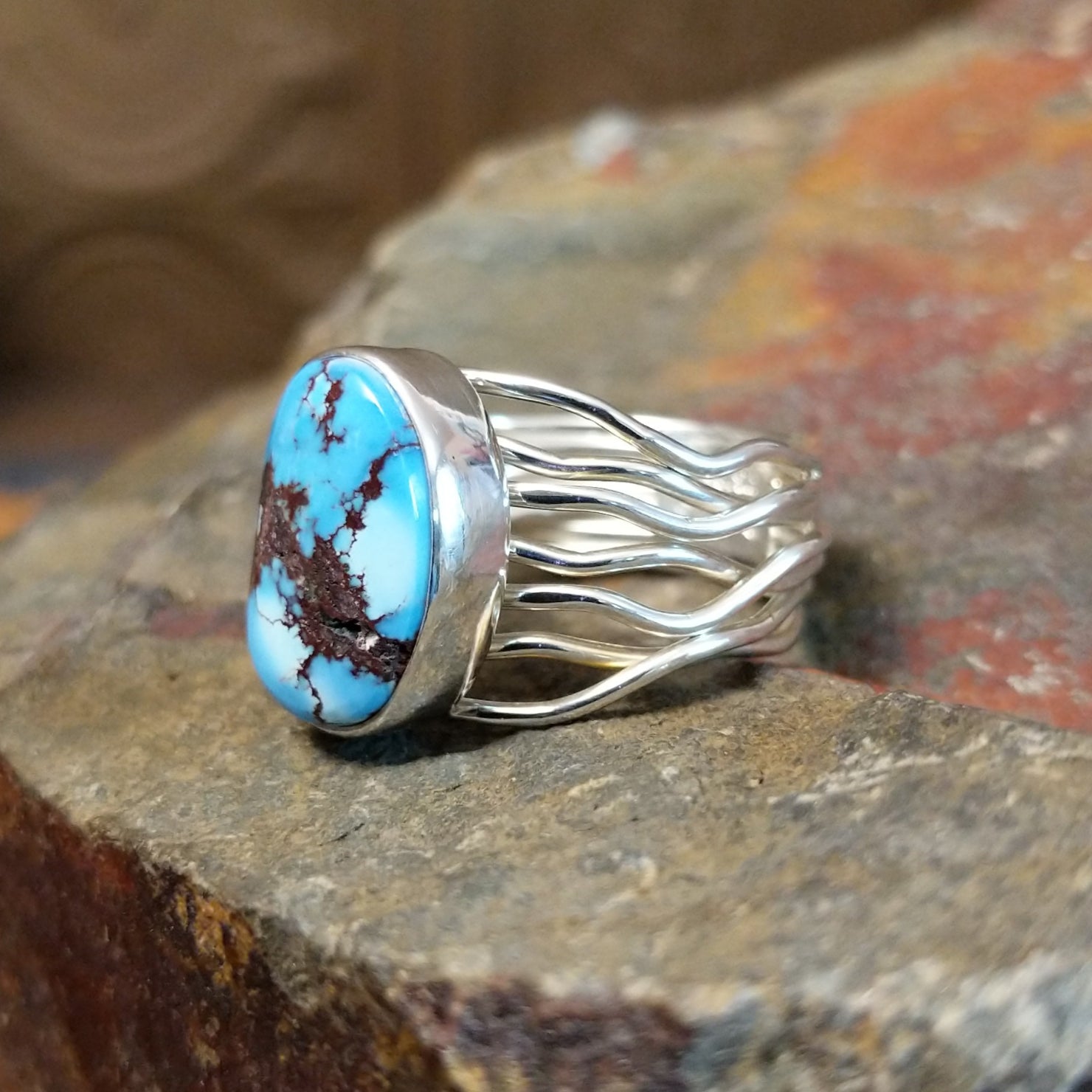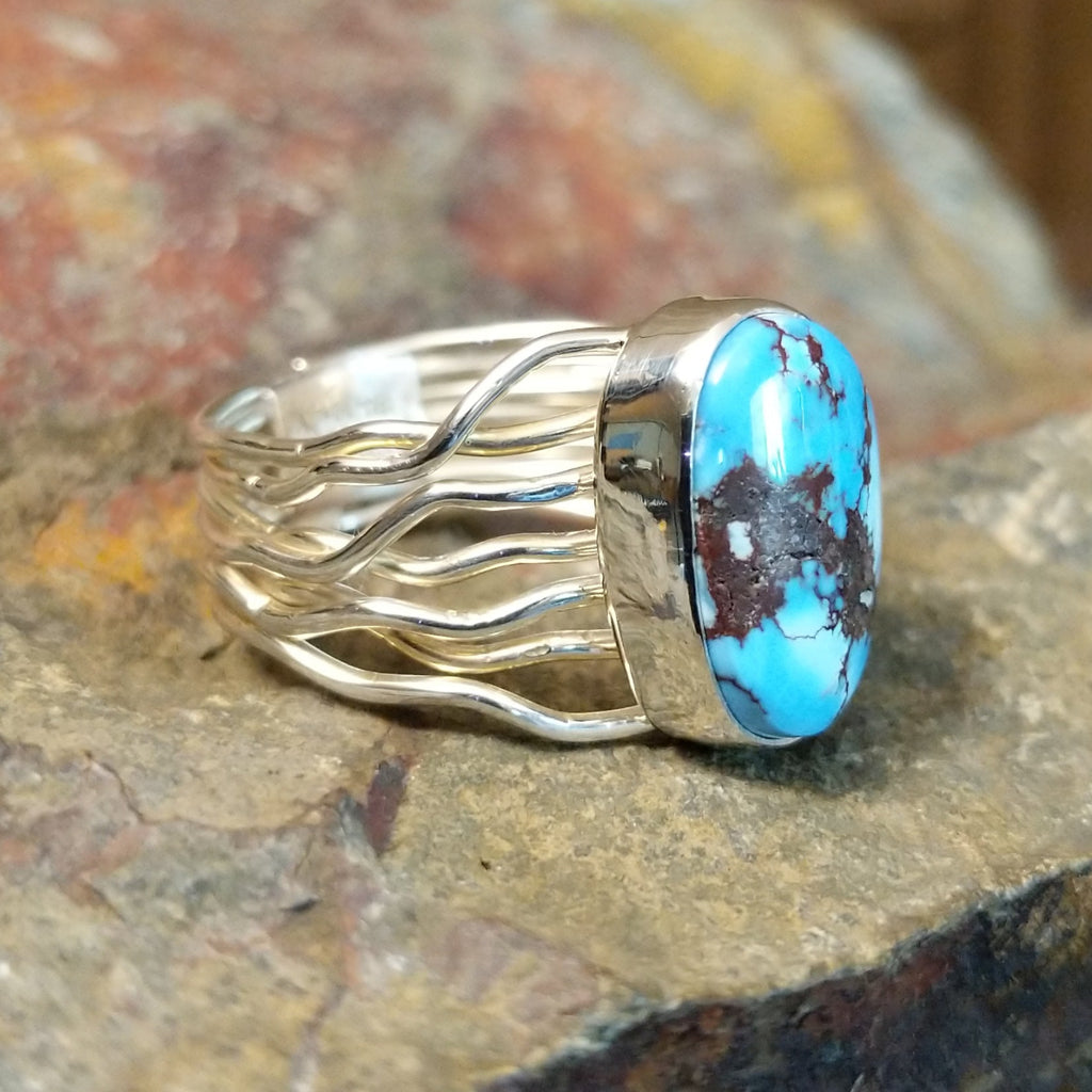 This striking ring by Angela Martin features a large oval turquoise stone with vivid matrix veining, set in a smooth bezel within a wavy multi-strand silver band. The design flows effortlessly with this beautiful piece.