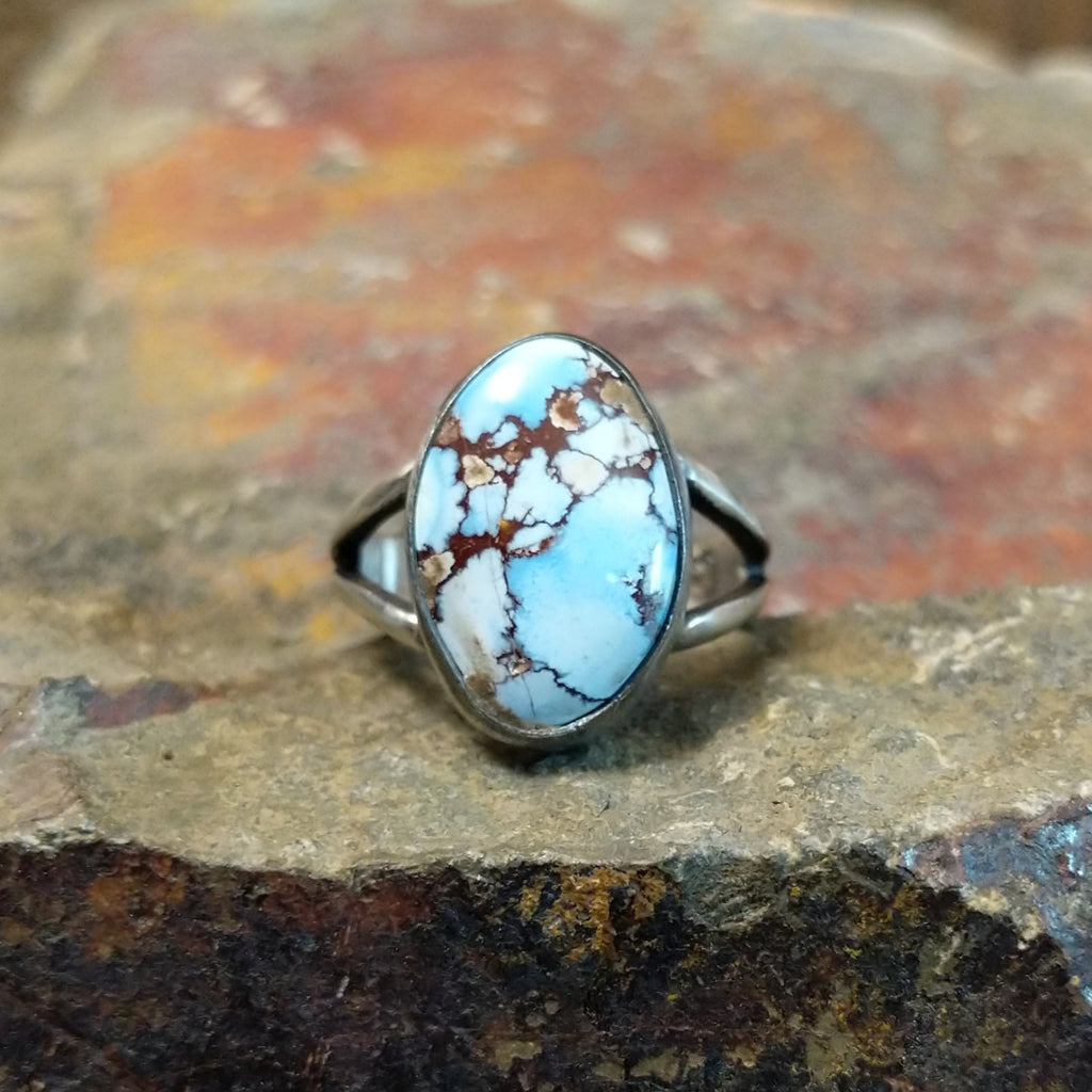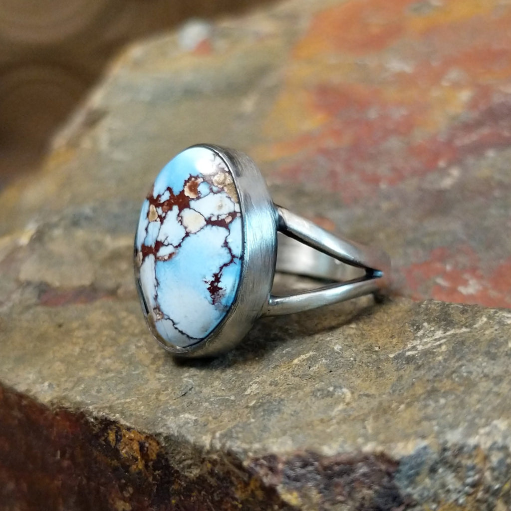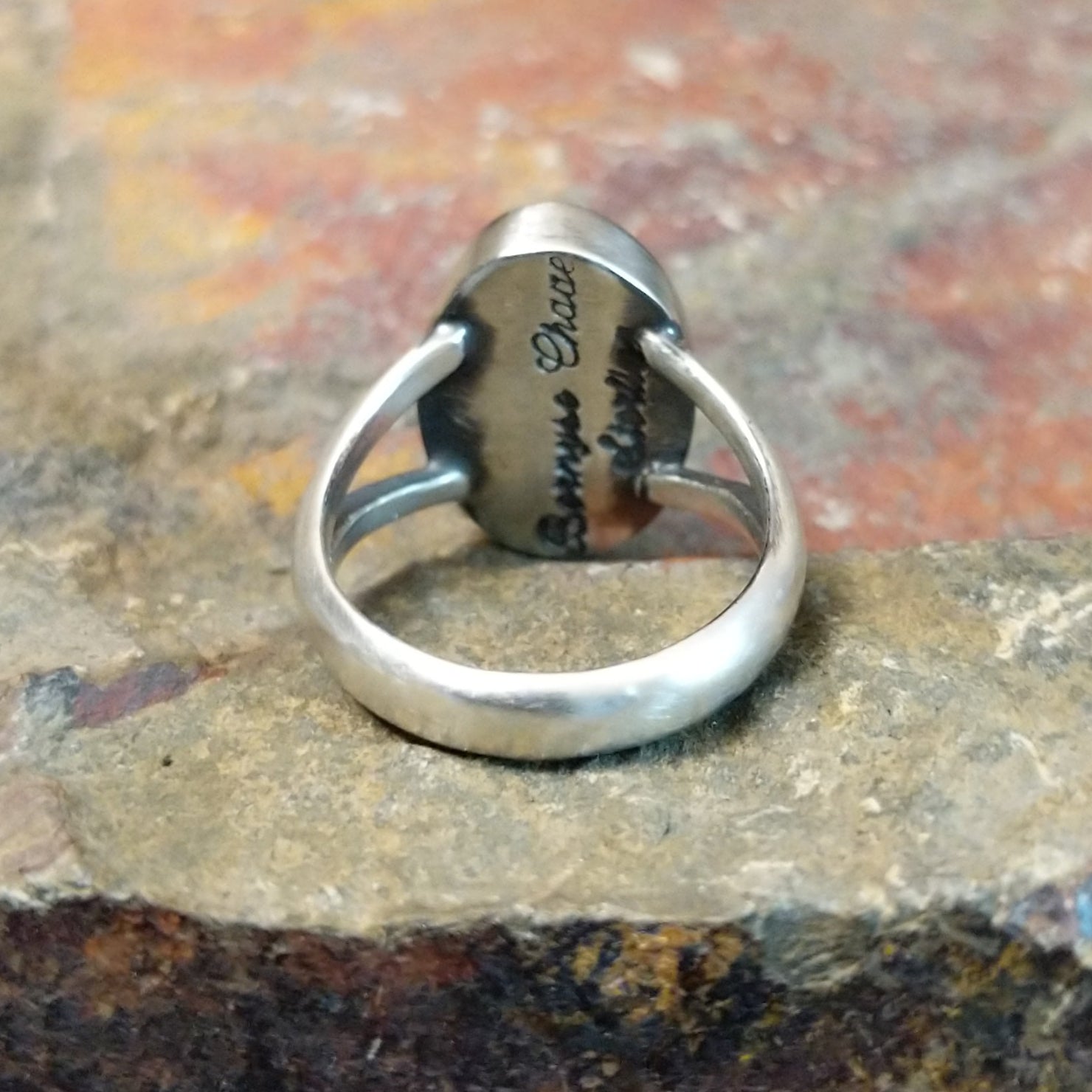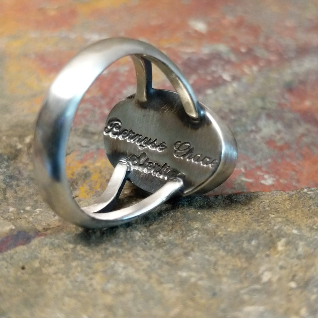 This ring by Bernyse Chavez showcases a large oval turquoise stone with striking matrix veining, set in a smooth bezel that showcases its beauty. The silver band gleams with a simple elegance, reflecting the artisan’s skilled craft.