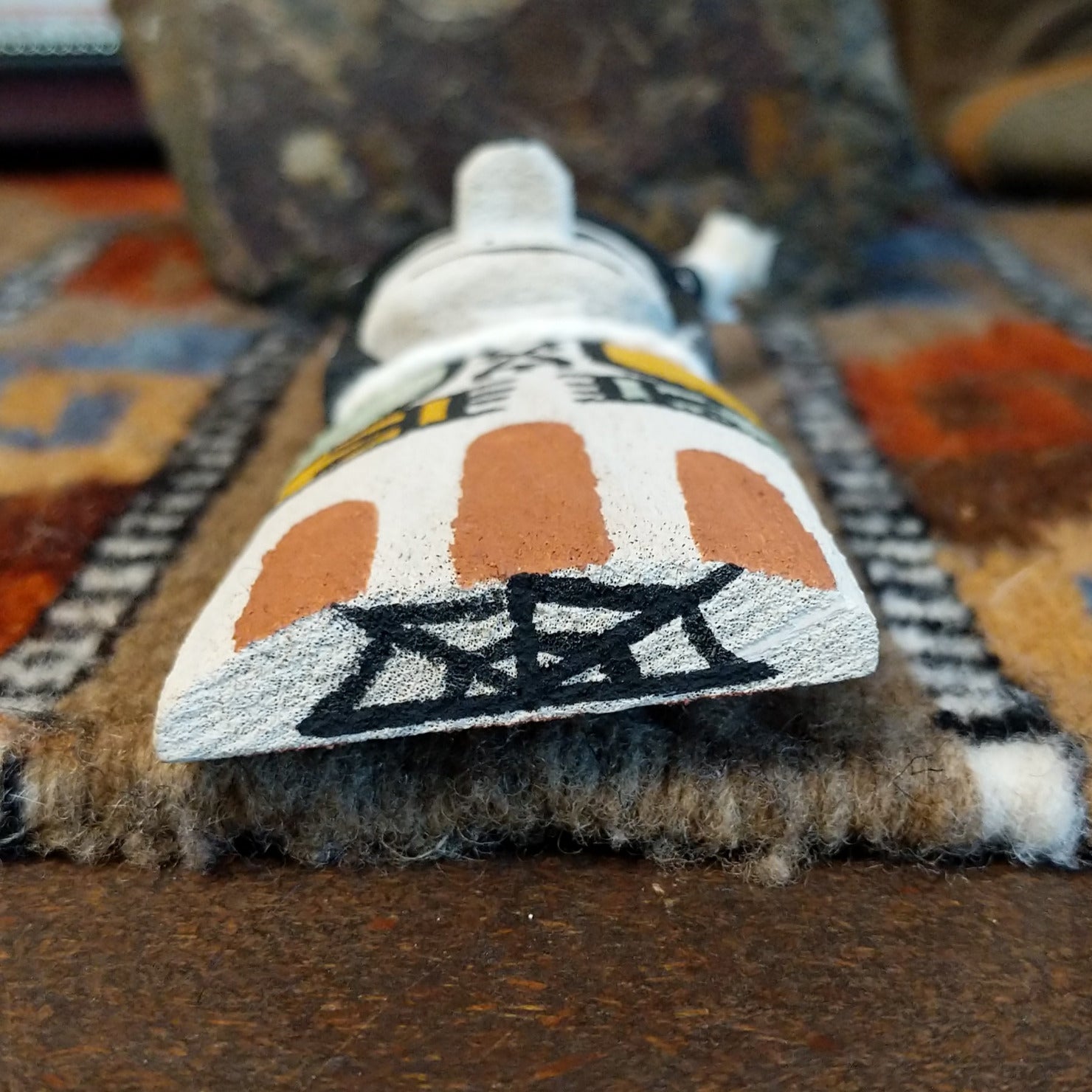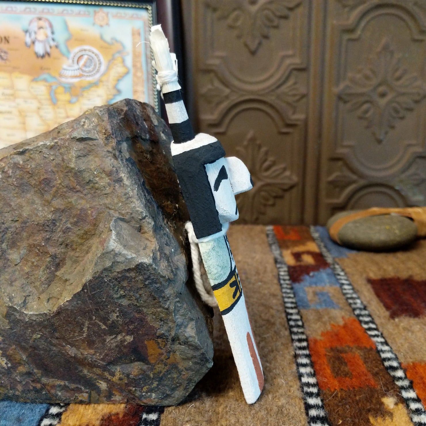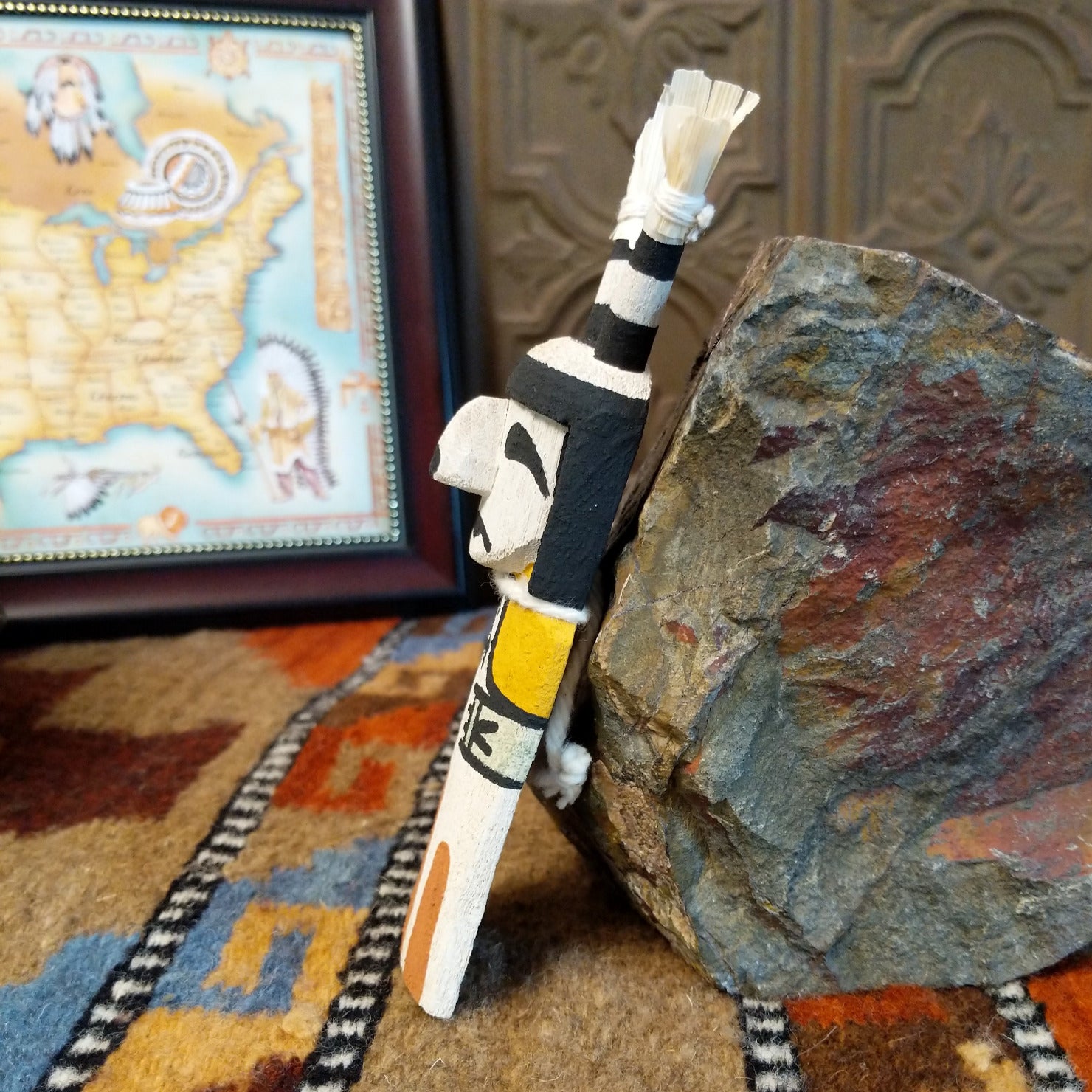 This clown kachina by Hopi artisan Raynard Lalo is finely carved from wood, featuring traditional black and white paint with vibrant color accents. Its distinctive corn husk horns add authentic detail, reflecting the skilled artistry and craftsmanship.