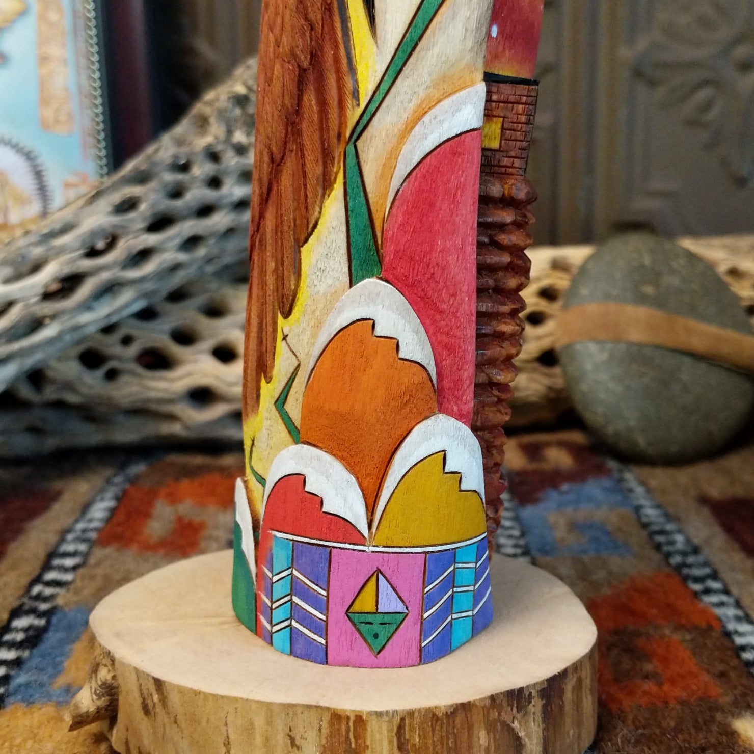 This sun kachina by Hopi artisan Harold Nevayaktewa features expert wood carving with intricate painted details of stars and an adobe motif with carved wood texture. The sunface is delicately carved and enhanced with feather accents, embodying the spiritual symbolism and dedicated craftsmanship.