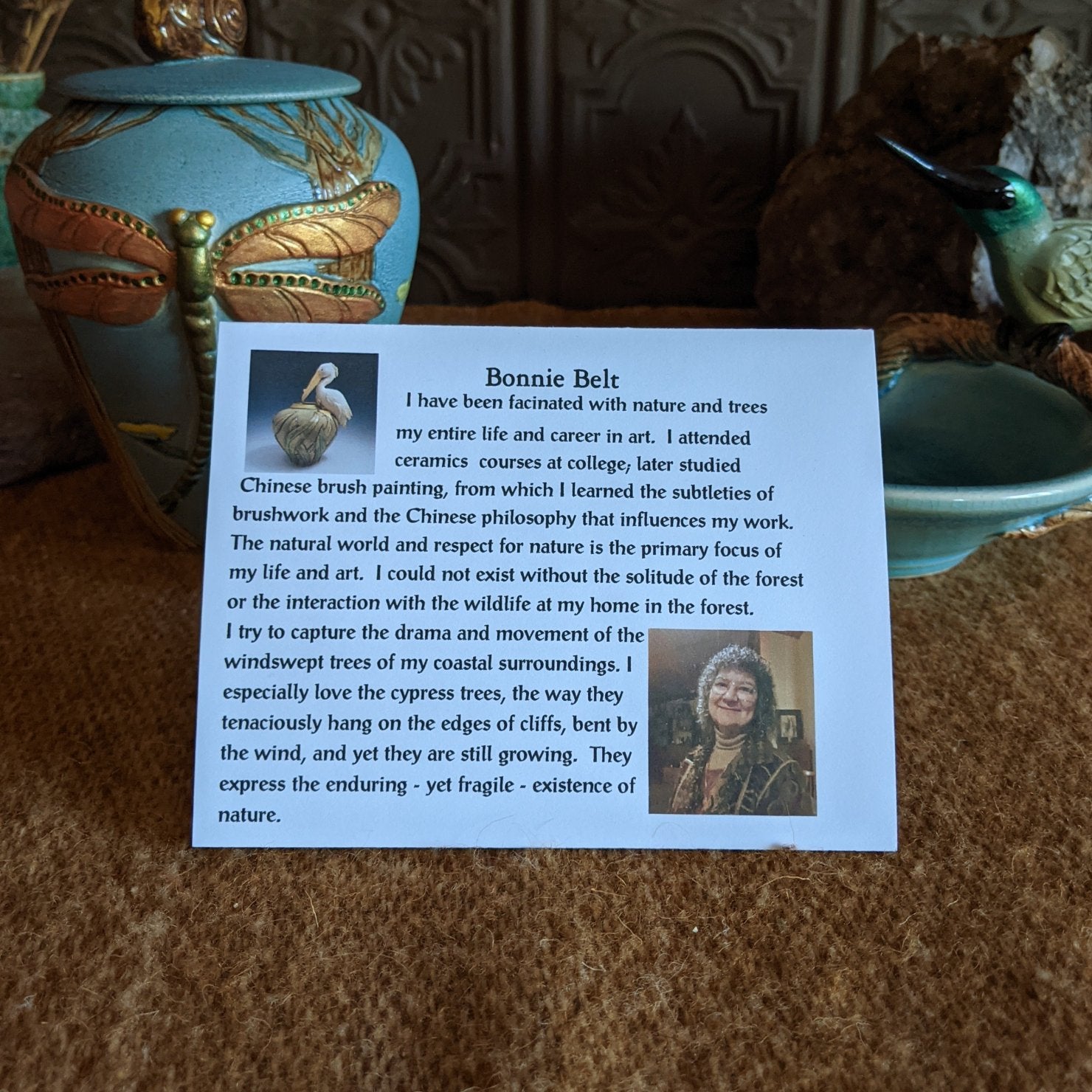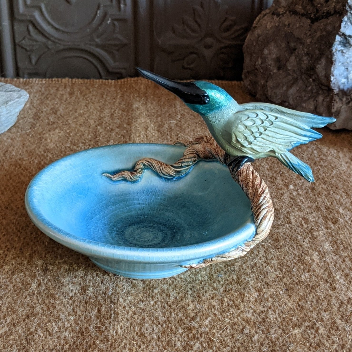 This vase features a sleek, glossy glaze on the watering bowl, complemented by a branch with a distinctive, textured finish and a hummingbird perched gracefully on top. It’s an exquisite piece from Bonnie Belt.