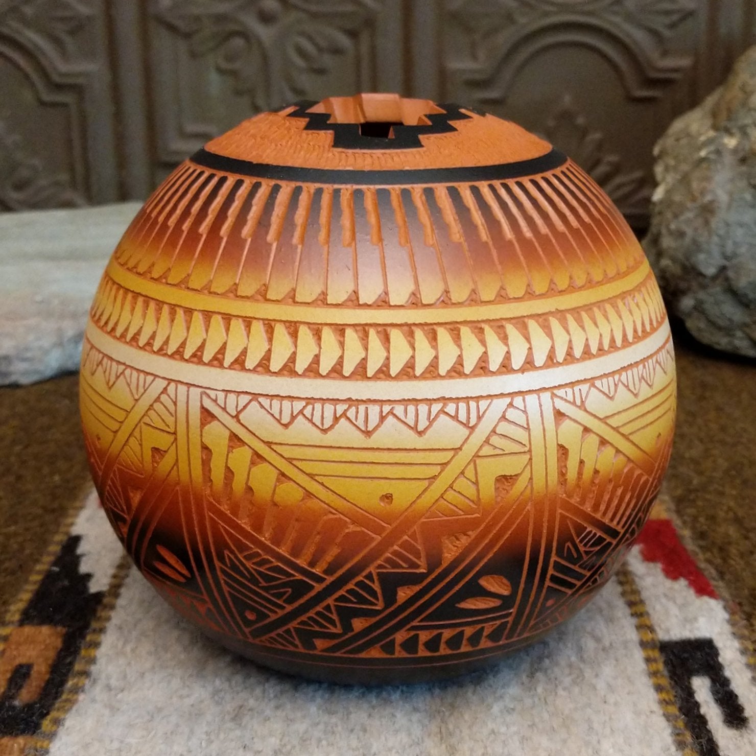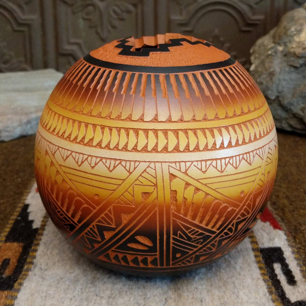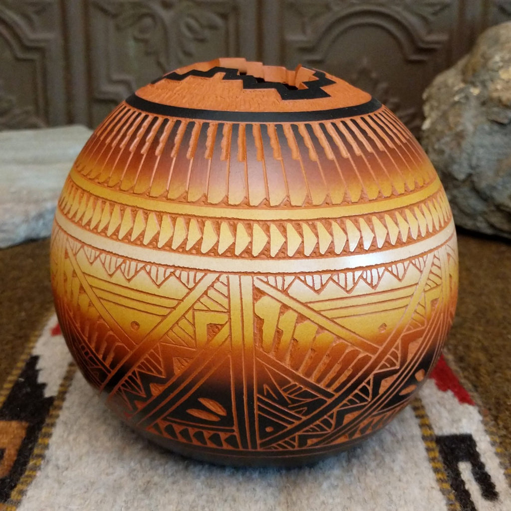 This spherical pottery features a distinctive mouth design, stepping inward from three points to make the mouth of the pot. Its surface is adorned with intricate, hand-etched patterns, creating captivating textures while the warm tones blend seamlessly with black, giving the piece a rich appearance.