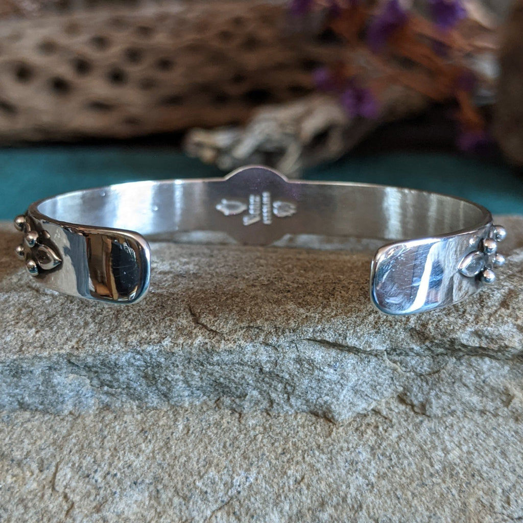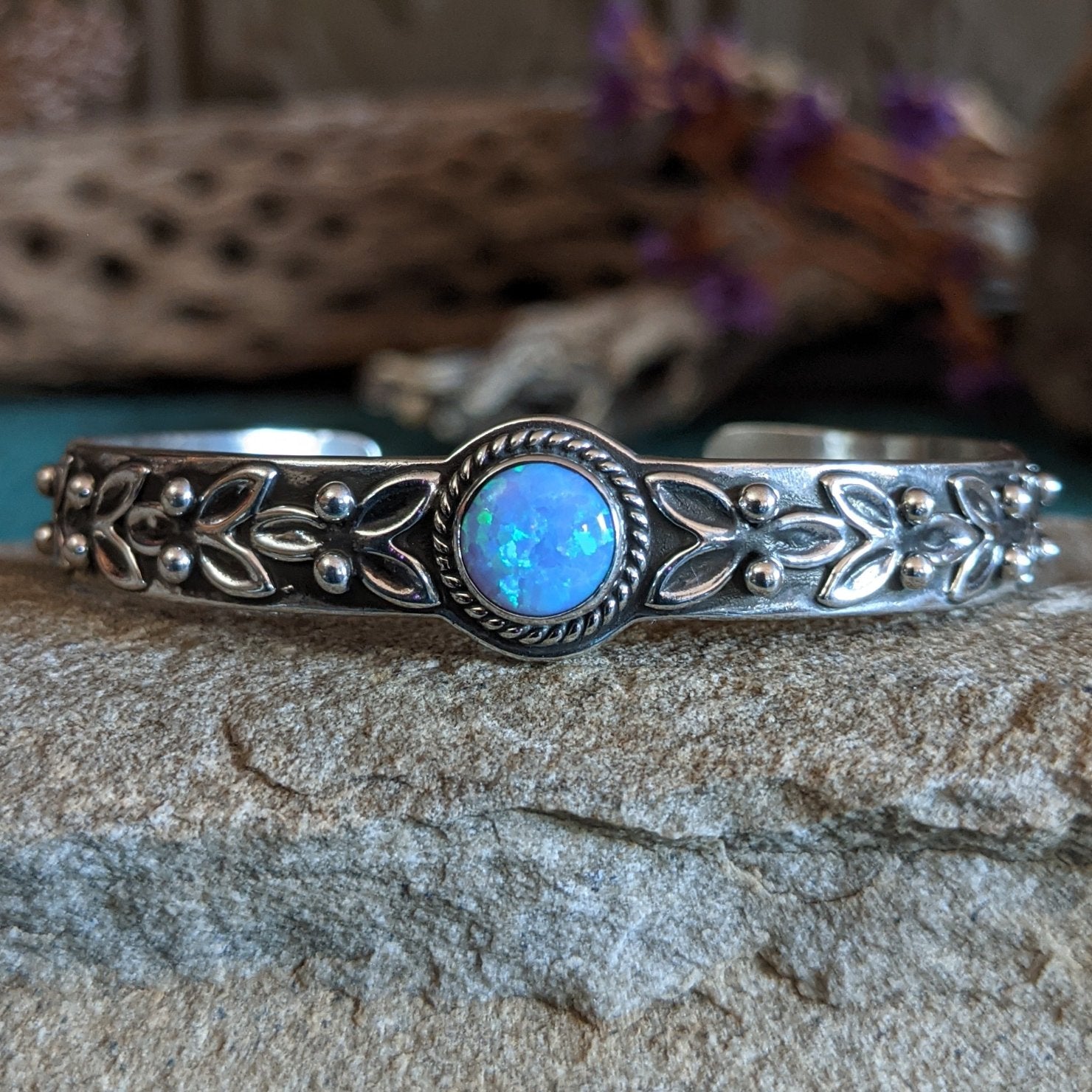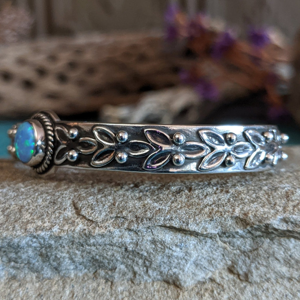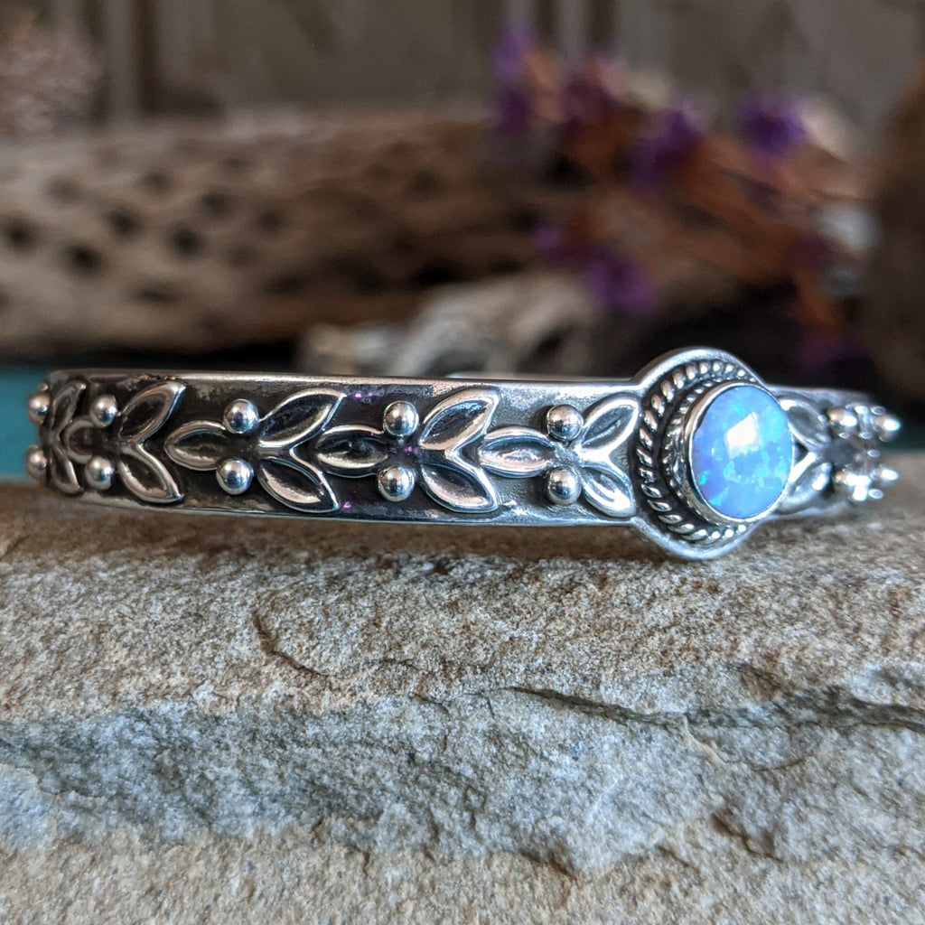 A round, vibrant blue manmade opal is set in this silver cuff, which is beautifully adorned with delicate silver leafing and beadwork along the band.