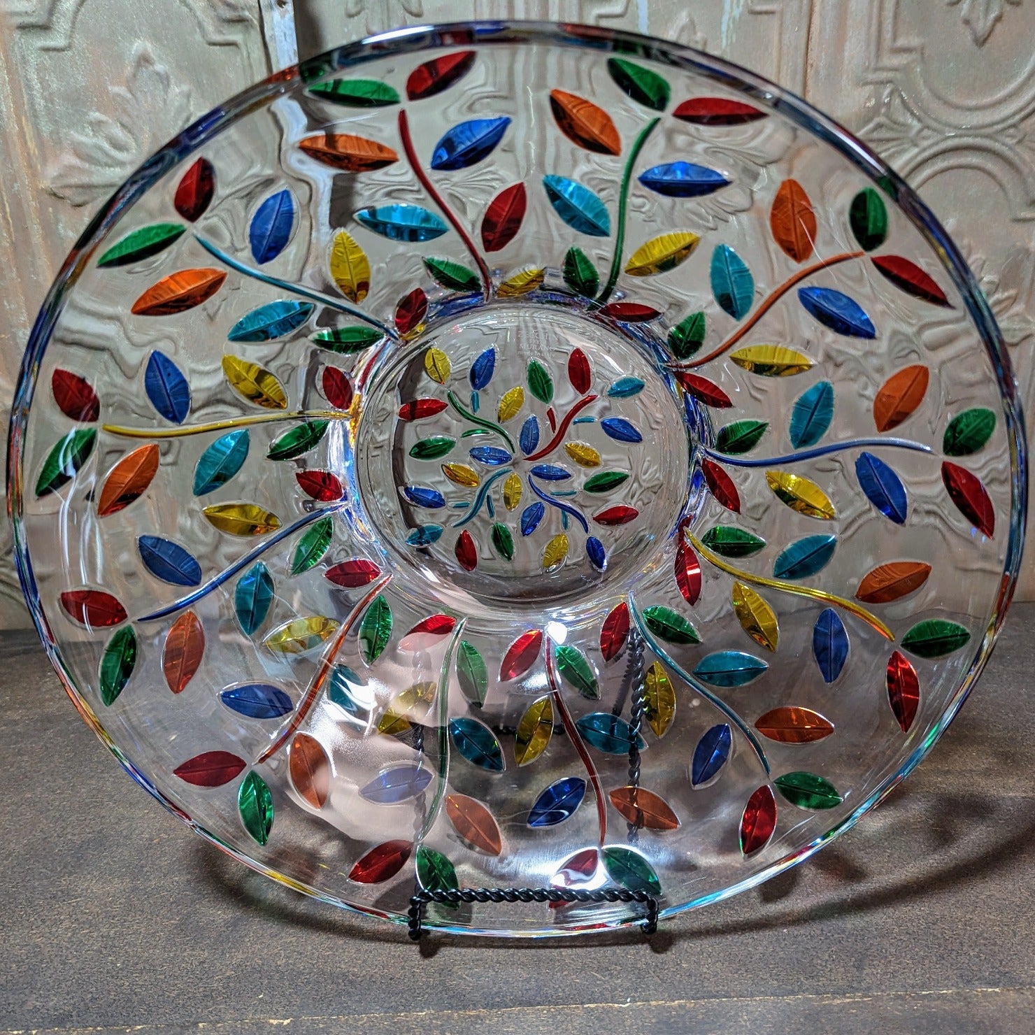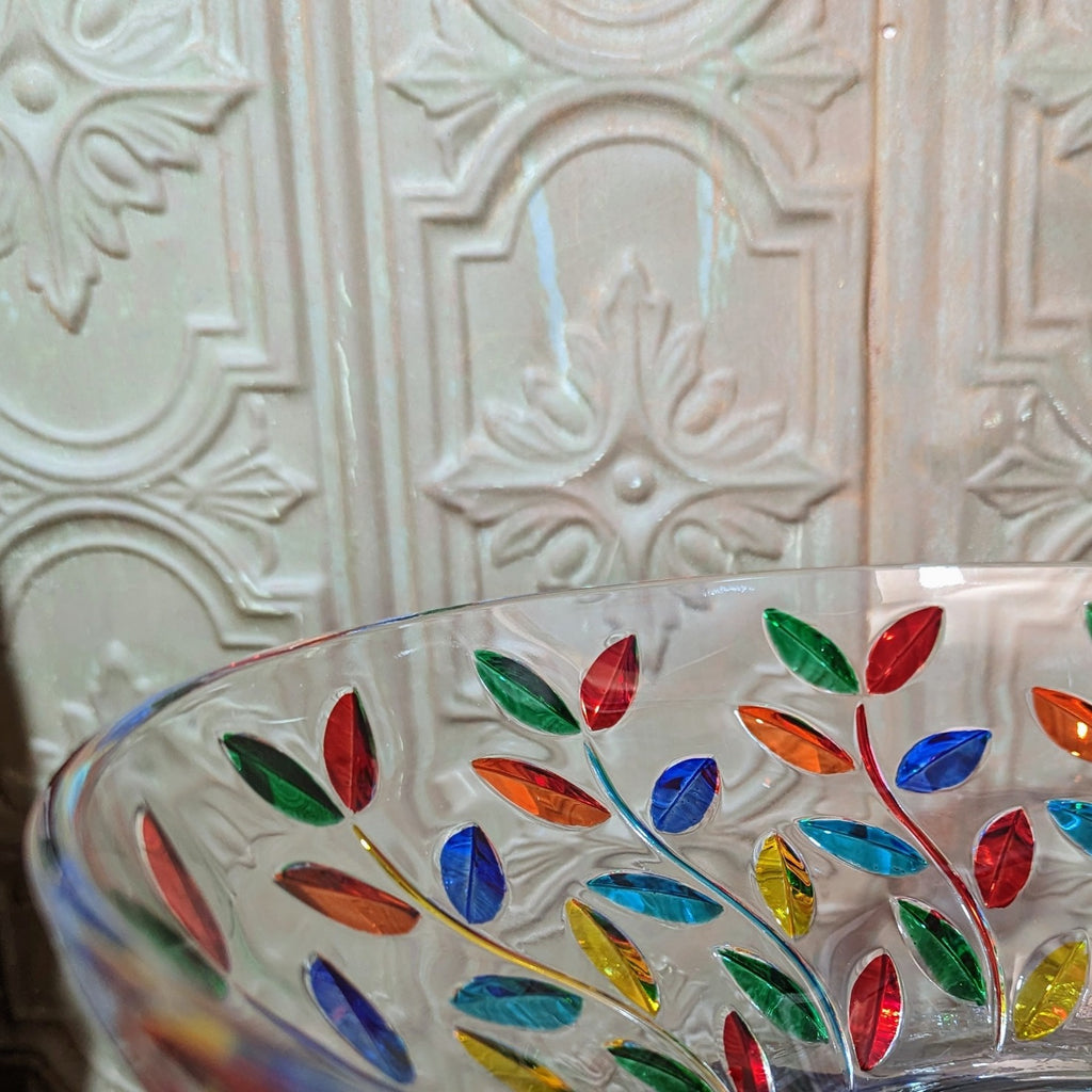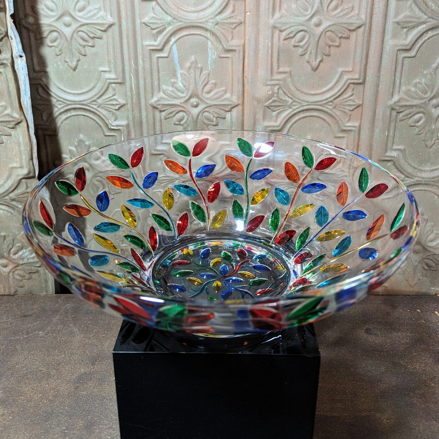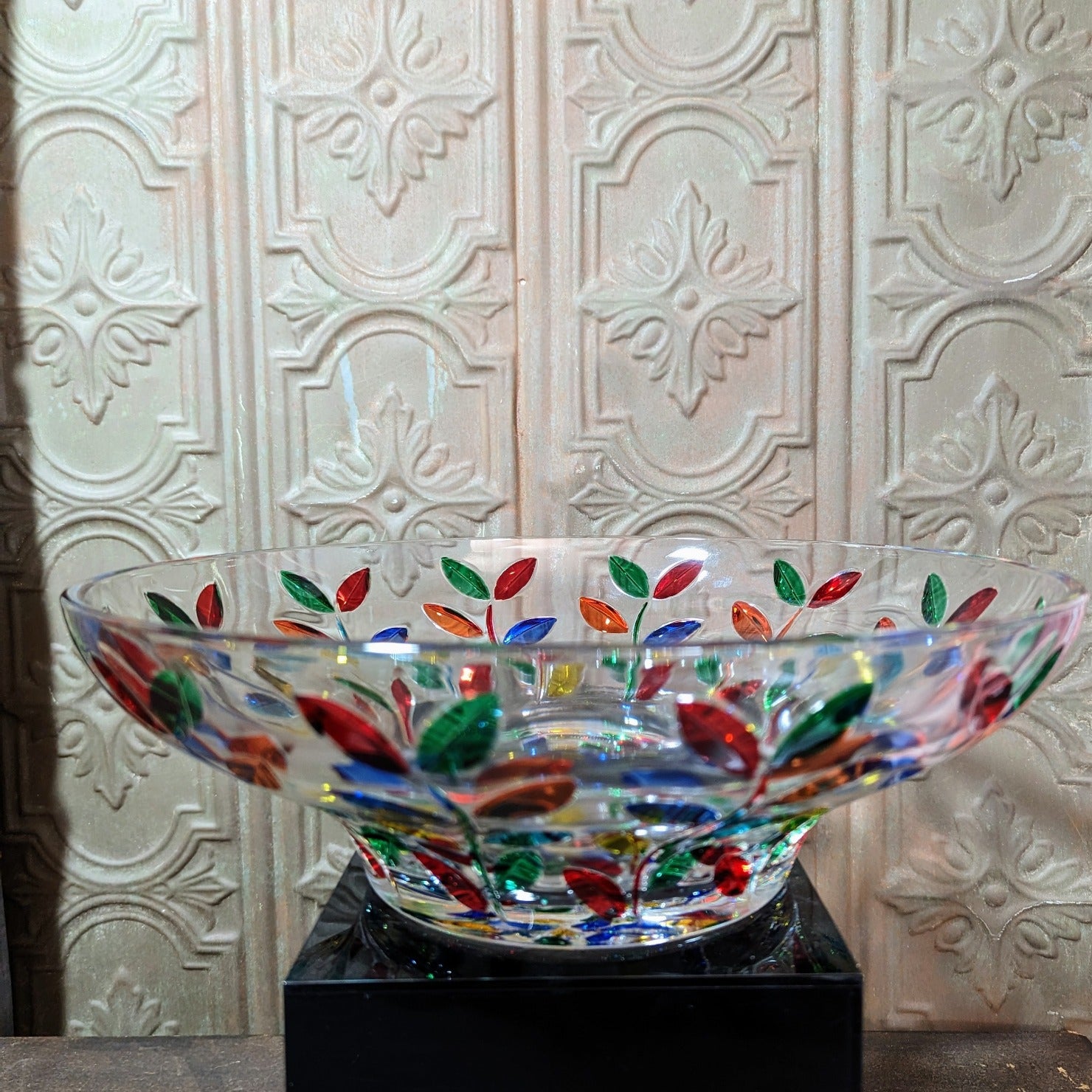 This is a beautiful Murano glass bowl painted with a colorful stem and leaf design. This bowl is made in Italy of quality, heavy glass.