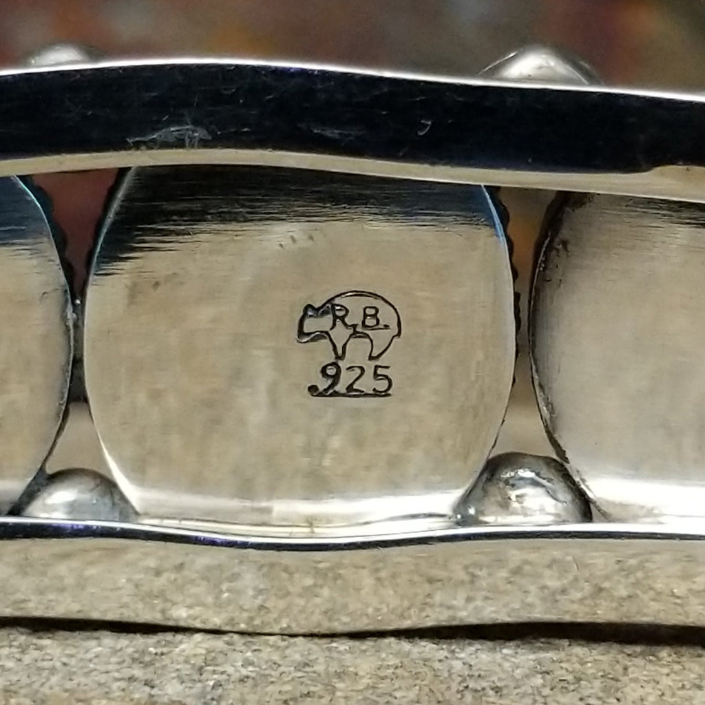 Large ovals of black onyx sit on this mirror-finished silver cuff. Silver roping wraps around each bezel and large beads of silver sit between the stones, contrasting nicely with their darkness.