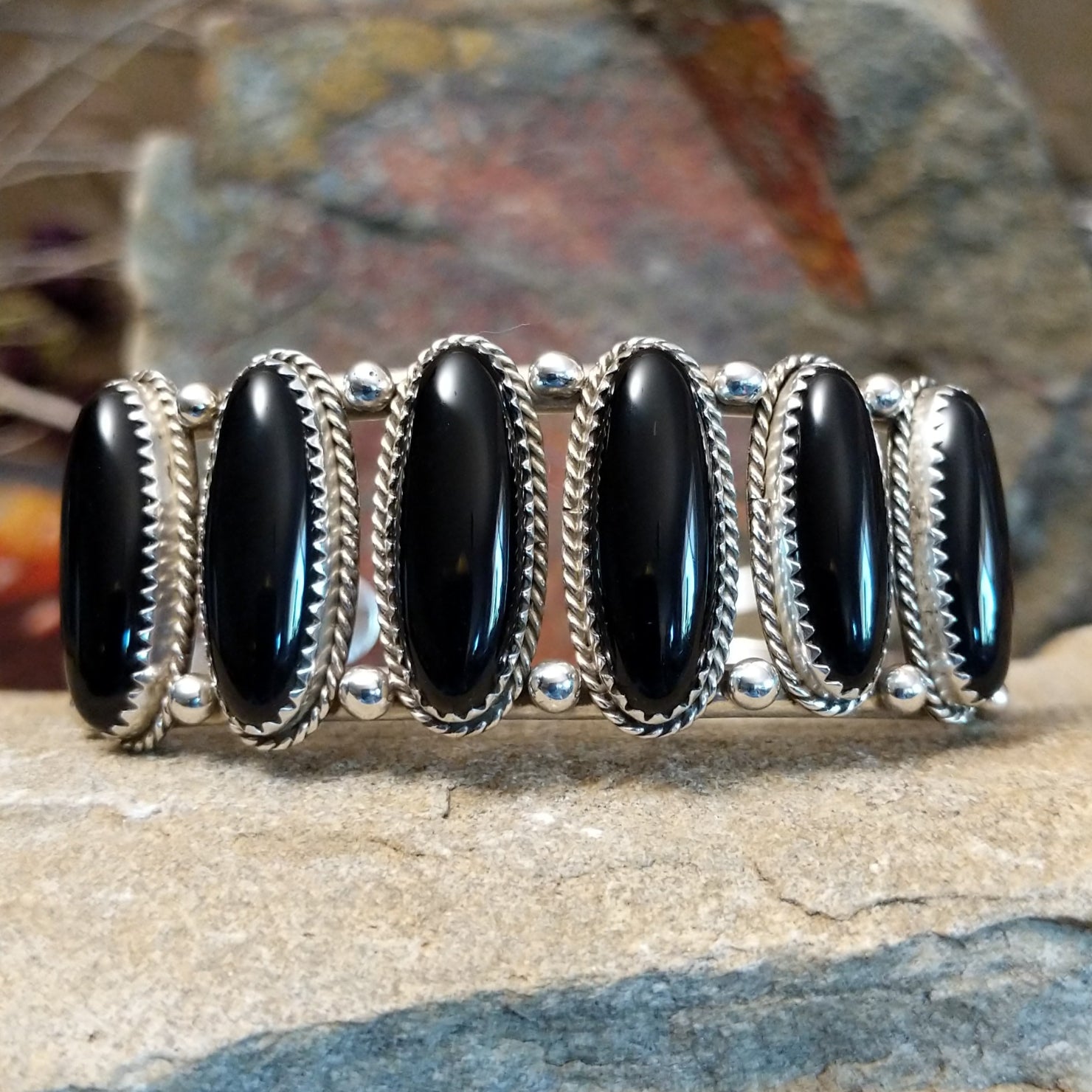 Long ovals of black onyx sit prominently on this beautiful silver cuff. Silver roping wraps around each stone and large beads of silver create a lovely motif.