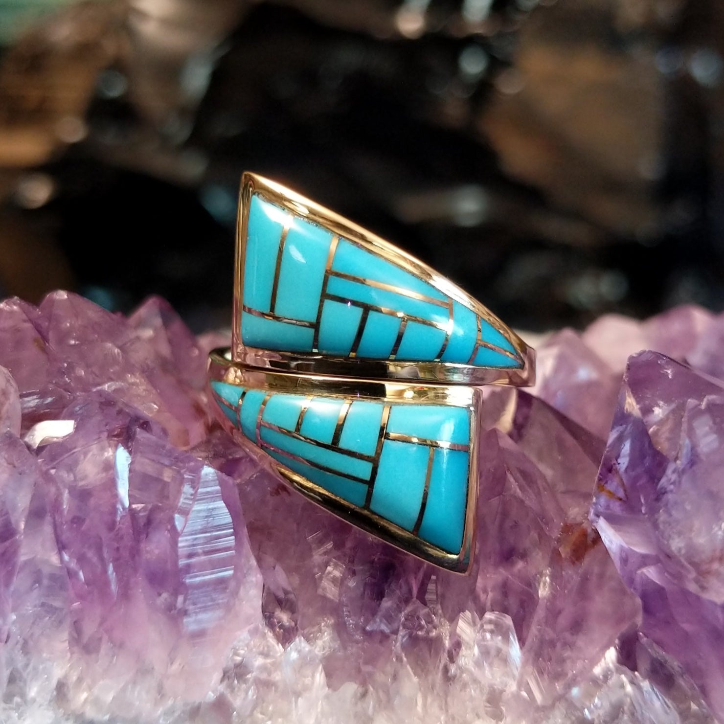 This bold Navajo ring features two opposing triangular inlays of vivid turquoise, set within a split 14k gold band. The mosaic-style patterning gives the piece a sense of movement, balancing tradition with a graphic, contemporary edge.