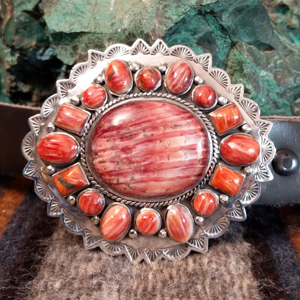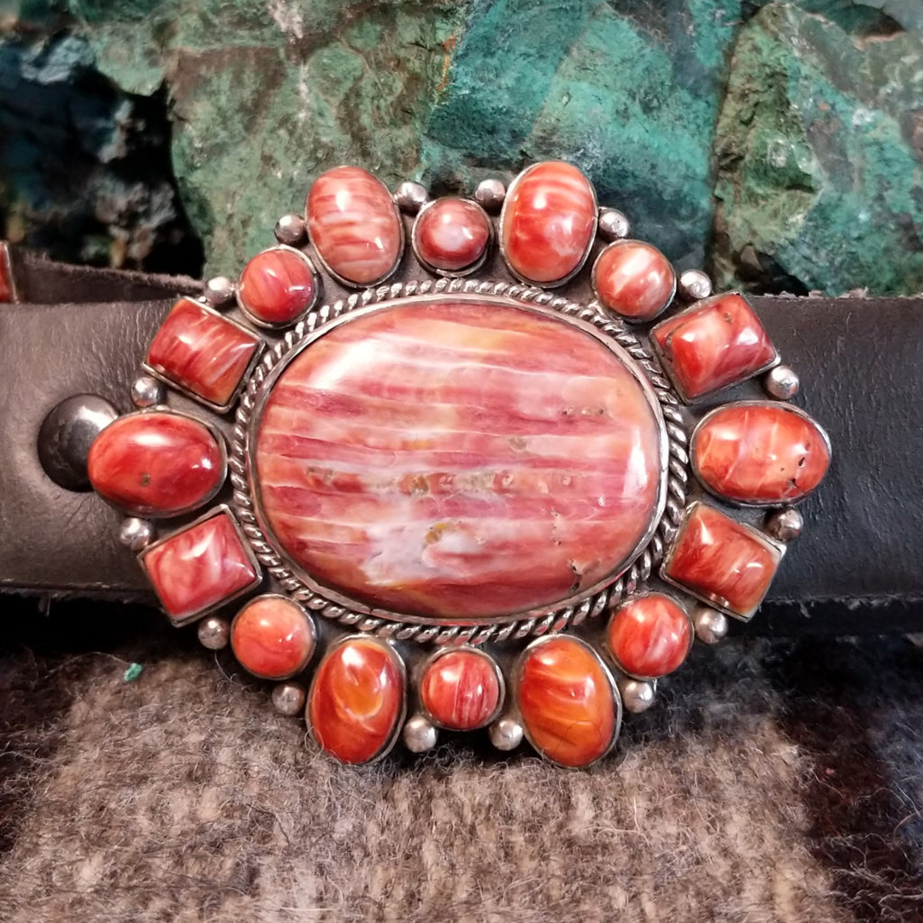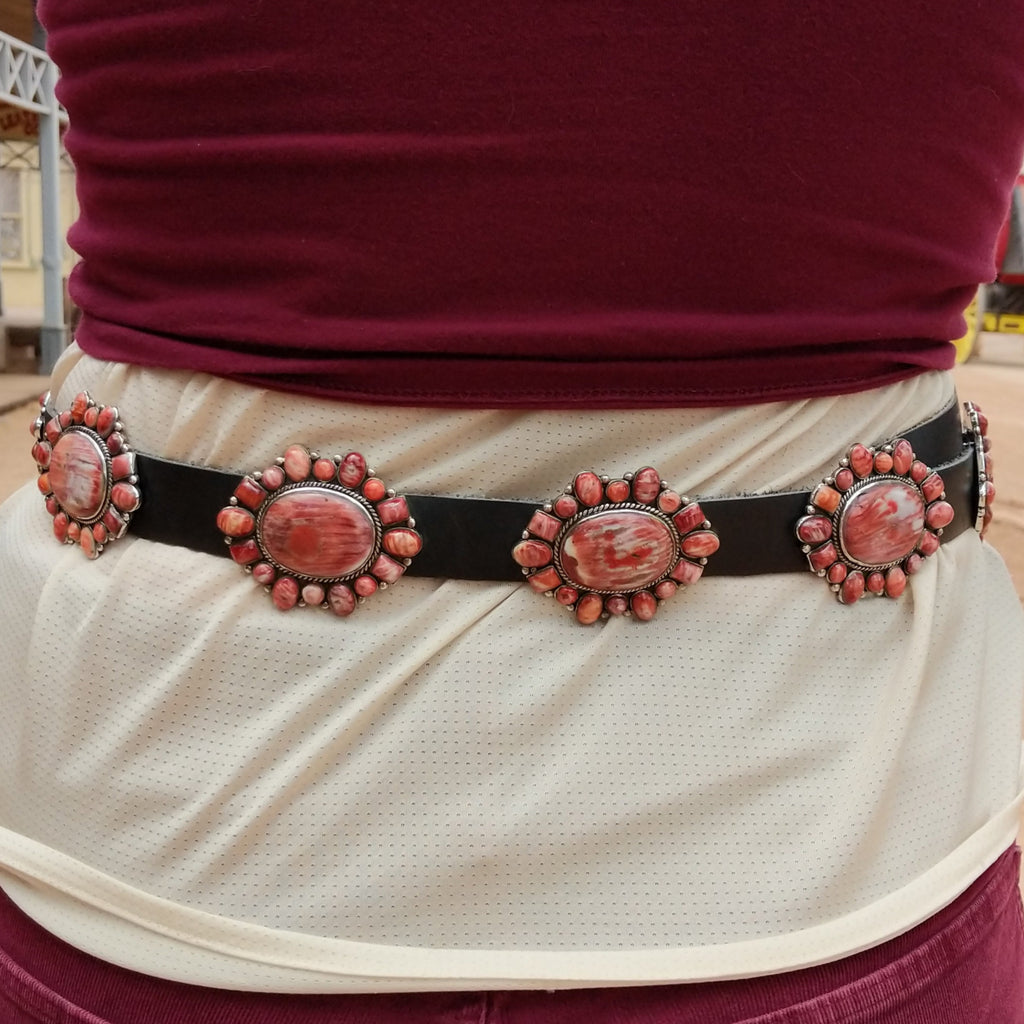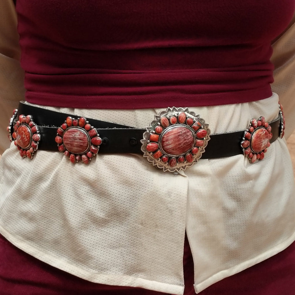 Red Spiny Oyster Shell Concho Leather Belt by Thomas Nez GJ-BLT-0004
