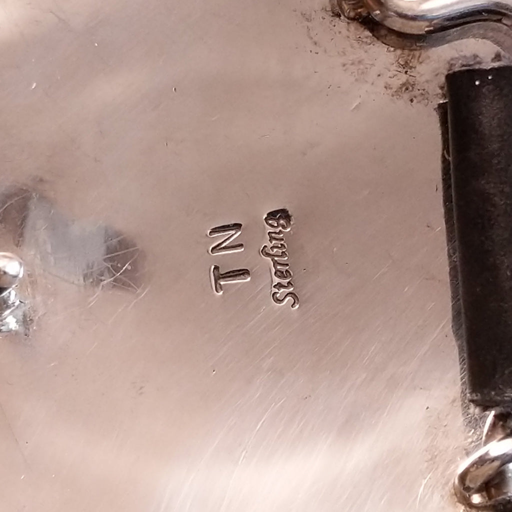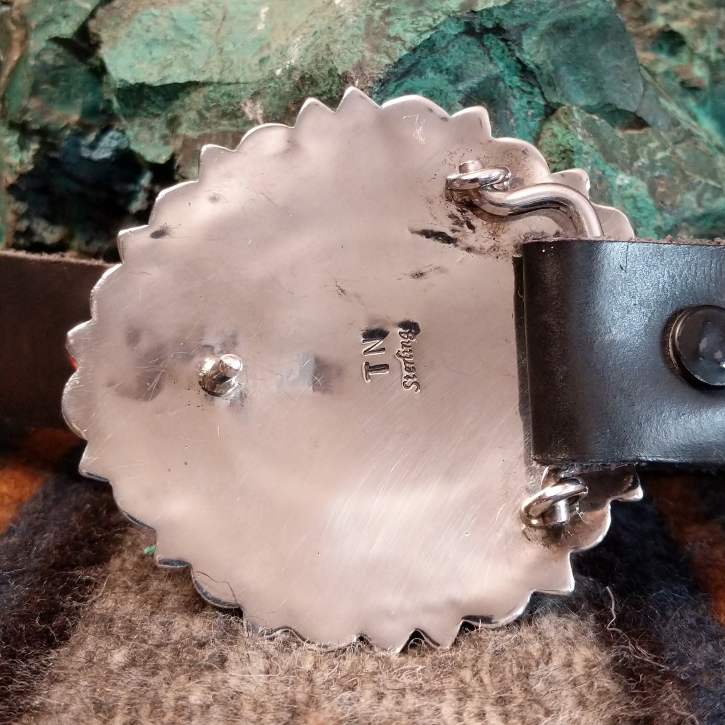 This concho belt handmade by Thomas Nez is truly one of a kind. The belt hosts ten conchos, each containing beautiful pieces of red spiny oyster shell set in patinated sterling silver. The black leather of the belt is unpunched, waiting to be fitted perfectly.