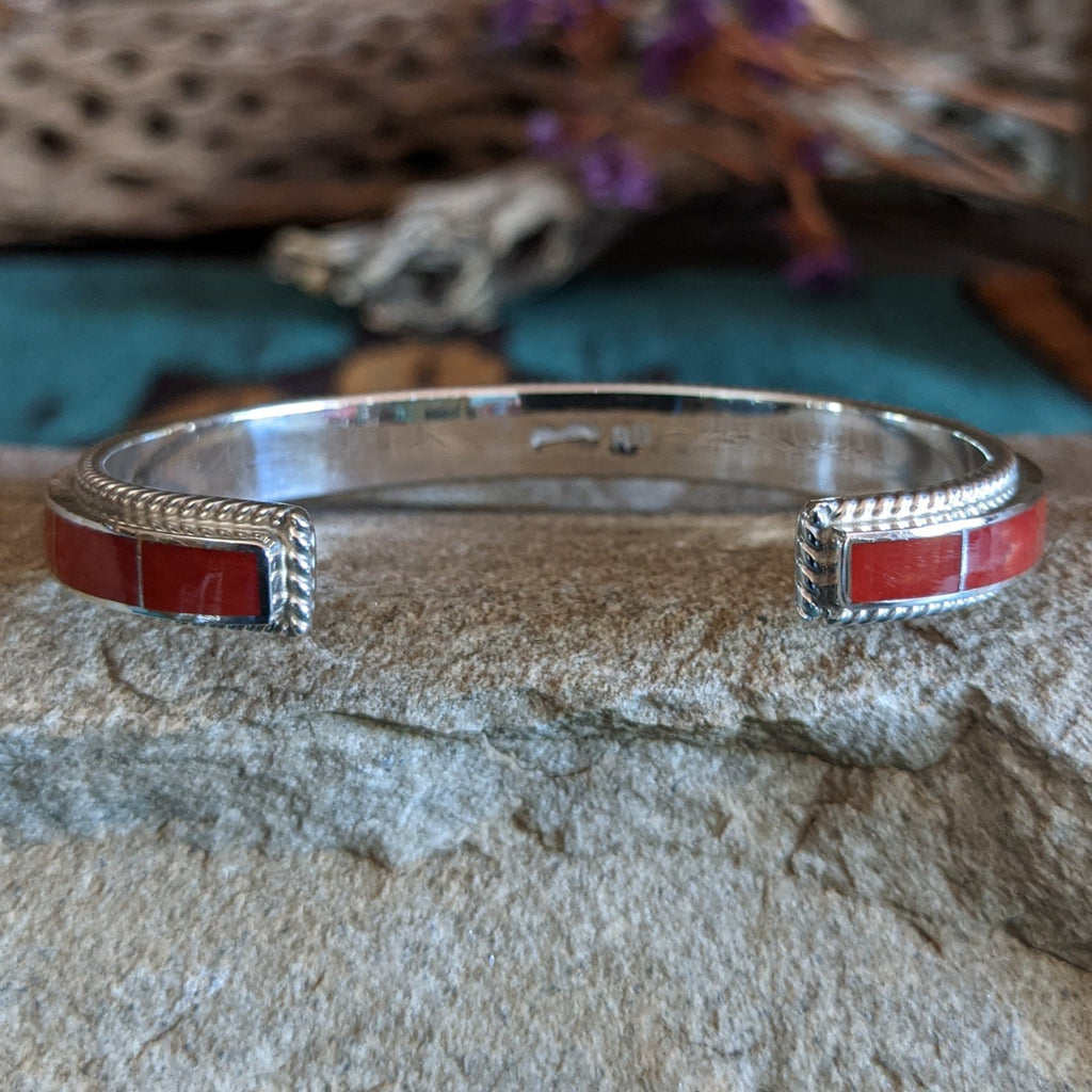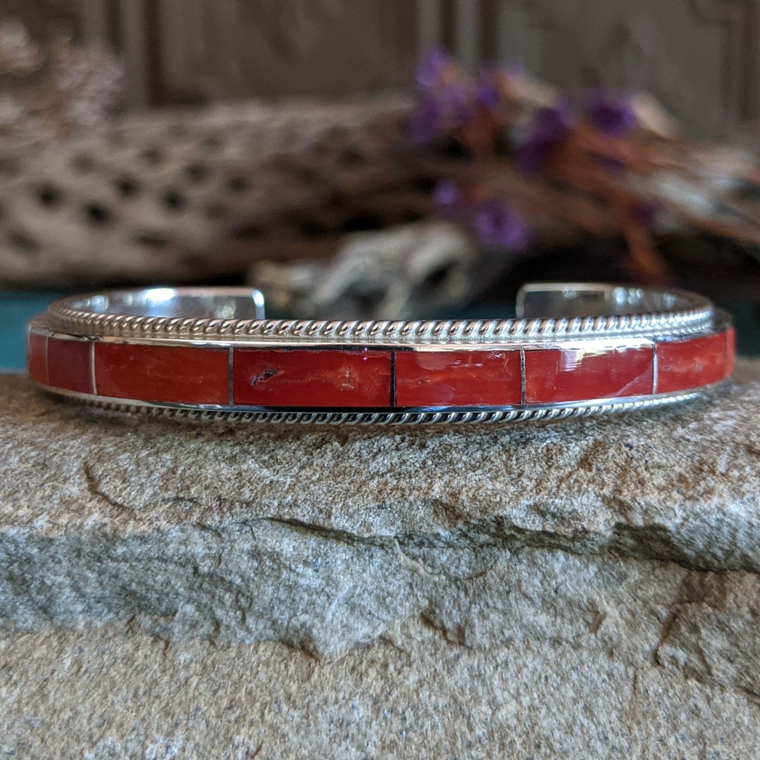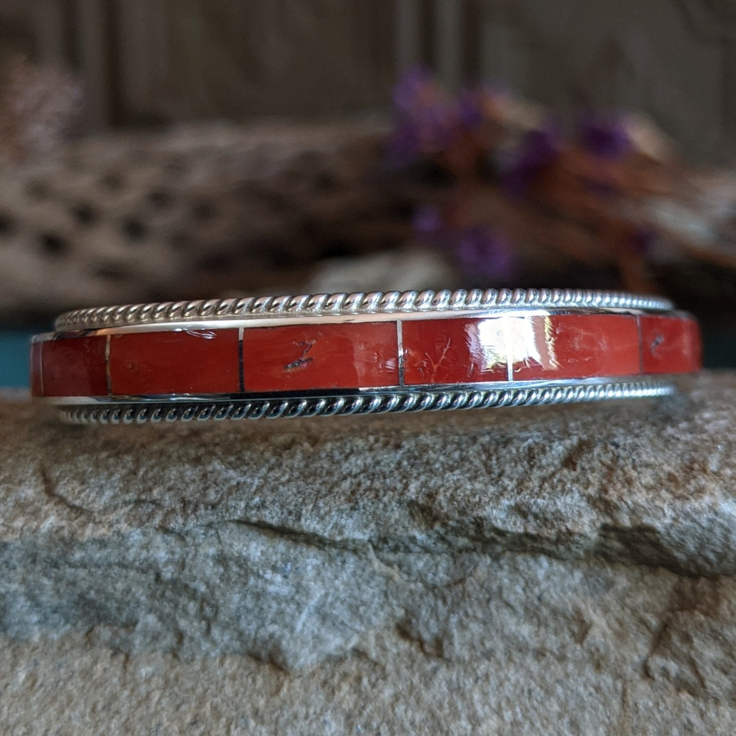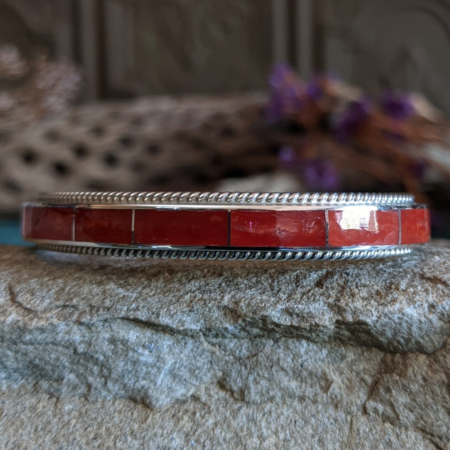 Red spiny oyster shell is inlaid along the entire length of this exquisite silver cuff. Fine silver lines separate each shell piece, while silver roping elegantly traces the outer borders, adding a refined touch to the design.