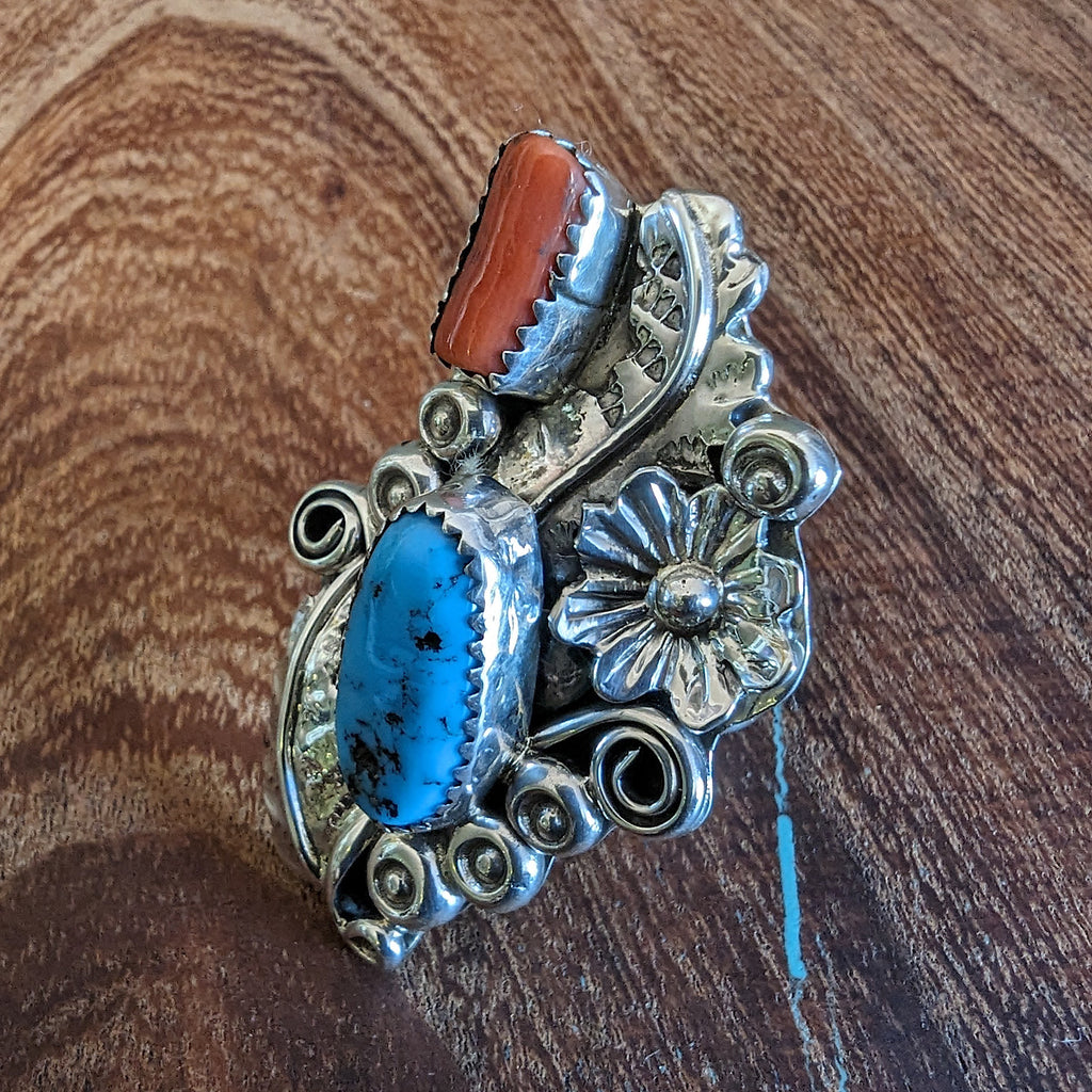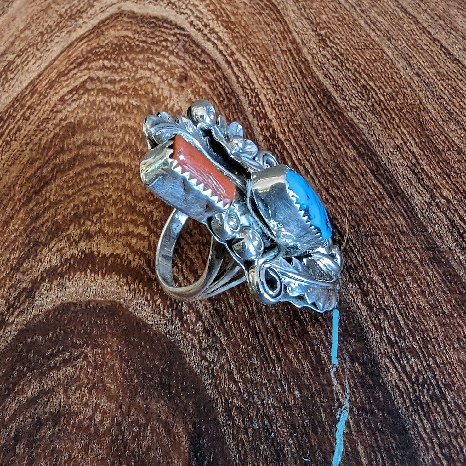 This distinct ring employs traditional silverwork and holds red coral and turquoise amidst the design. The silverwork features feathers, flowers, and foliage to give a very classic appeal to the ring.
