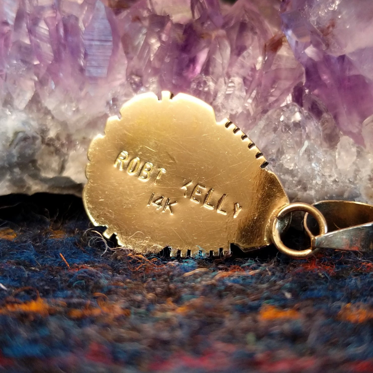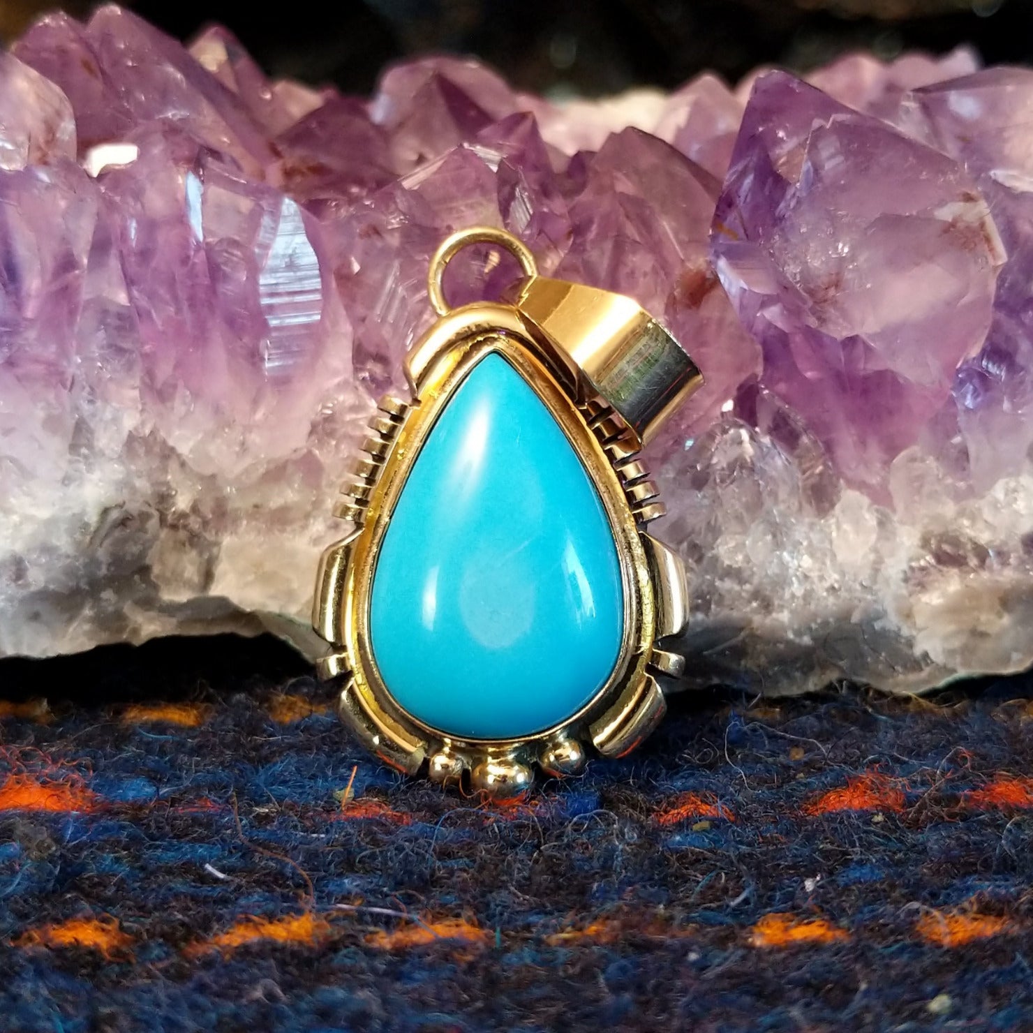 This pendant features a stunning teardrop-shaped turquoise stone, expertly set in polished 14k gold by the talented Robert Kelley. The design showcases Native American craftsmanship with intricate detailing and a smooth finish.